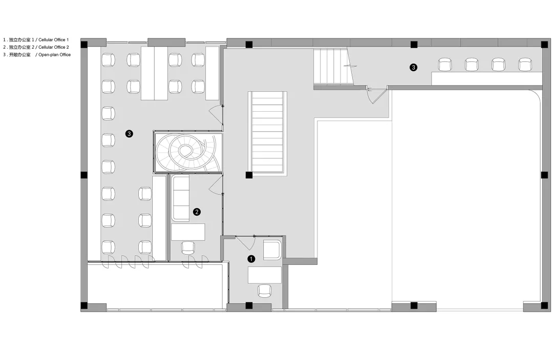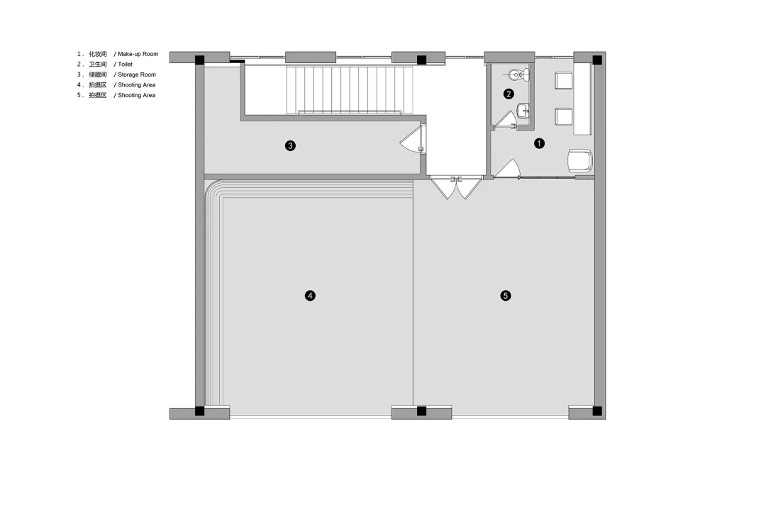 ASTUDIO攝影工作室位于CBD東側(cè)菁英谷文創(chuàng)園內(nèi),整體的設計風格融合了粗狂工業(yè)風和現(xiàn)代簡約風。原有建筑為雙層的廠房空間,這種大空間非常適合拍攝的需求。攝影師希望把這個大空間改造為兩個相對獨立的拍攝區(qū),并且有各自獨立的化妝間和出入口,從而可以同時進行兩場獨立的拍攝。UUA將原有的二層建筑在豎向上改造成為了三層的空間,其中第一層包含接待區(qū)和1號拍攝區(qū),第二層整體為辦公空間,第三層是2號拍攝區(qū),這種豎向上的分區(qū)保障了兩場同時拍攝的獨立性。