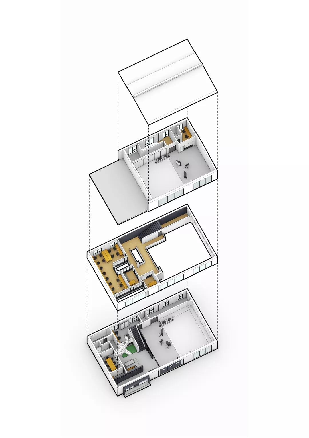 ASTUDIO攝影工作室是一個多功能的復合空間,UUA把拍攝、化妝、接待、辦公、會議、休閑等多種功能有機地融合在這個通高的廠房之中,空間緊湊又富于變化。拍攝區(qū)為最重要的功能單元,由于需要足夠的長寬高空間來滿足設置無影墻、布景布光以及拍攝距離等需求,所以設計師將一層的一半劃歸為1號拍攝區(qū),保留雙層通高的空間形式;另一半則加建出雙層空間,其中一層作為接待,二層作為辦公。廠房的三層因為原本具有足夠的層高,因此被設置為2號拍攝區(qū)。