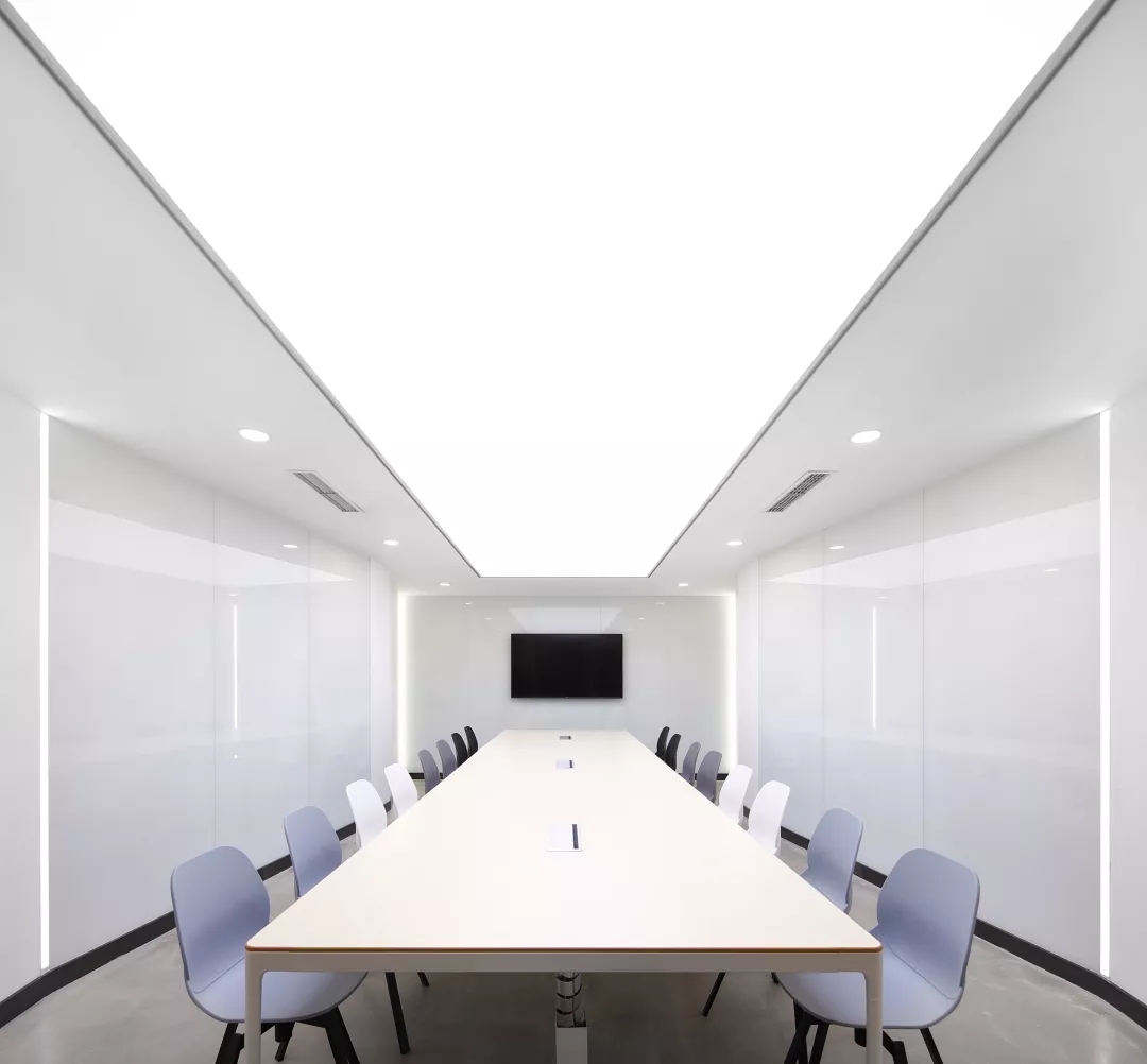靠近電梯入口的前臺(tái)通過頂部的放射狀線條設(shè)計(jì)產(chǎn)生視覺延伸感,兩側(cè)區(qū)域通過軟裝陳設(shè)實(shí)現(xiàn)多層次的空間,靈活滿足接待、等候、會(huì)議及咖啡茶點(diǎn)的各種需求,員工和來訪人員各取所需互不干擾。