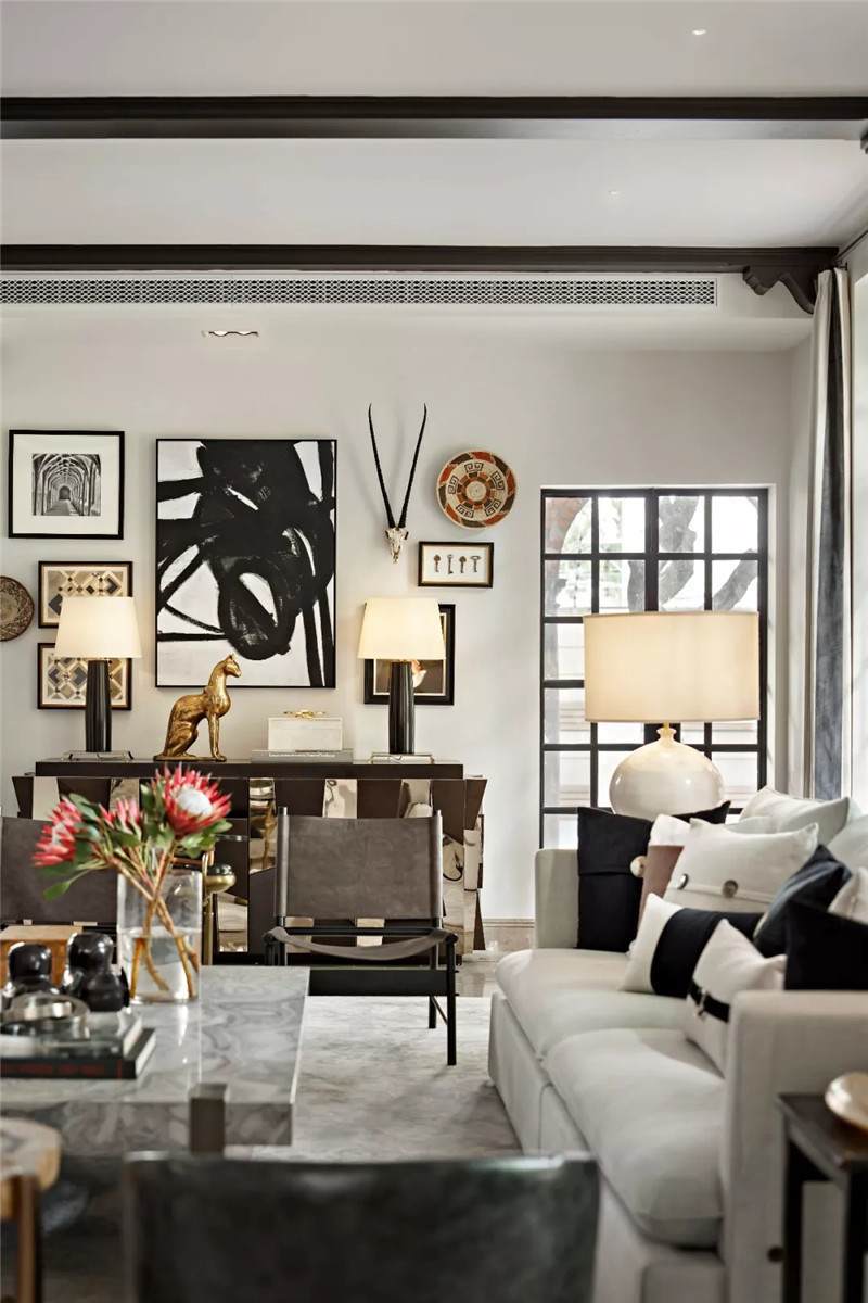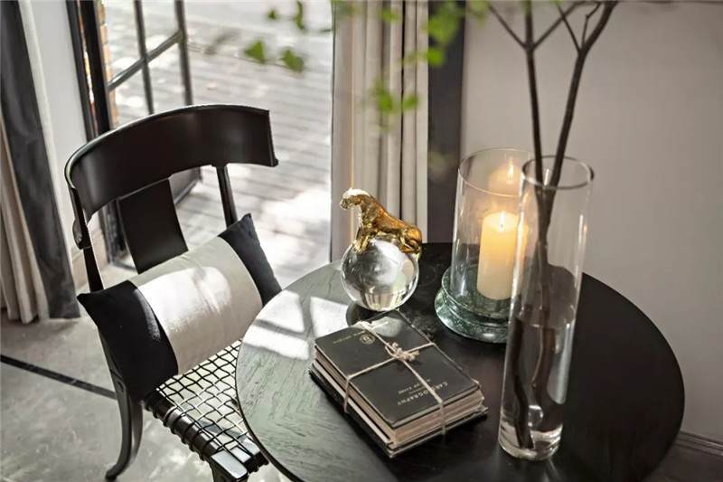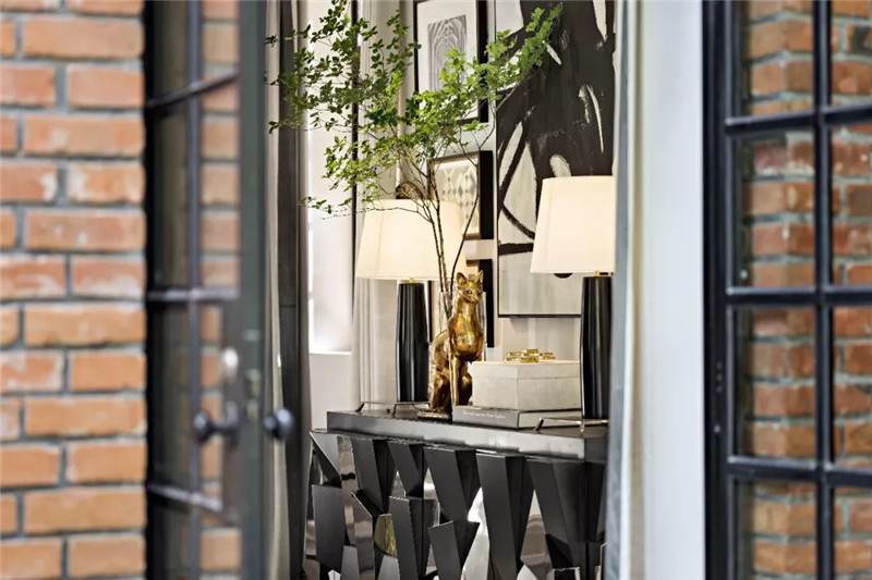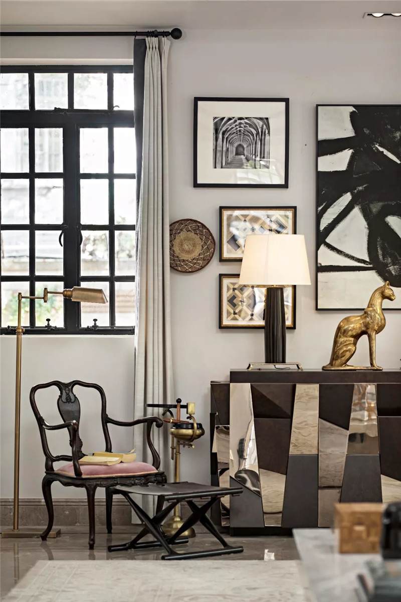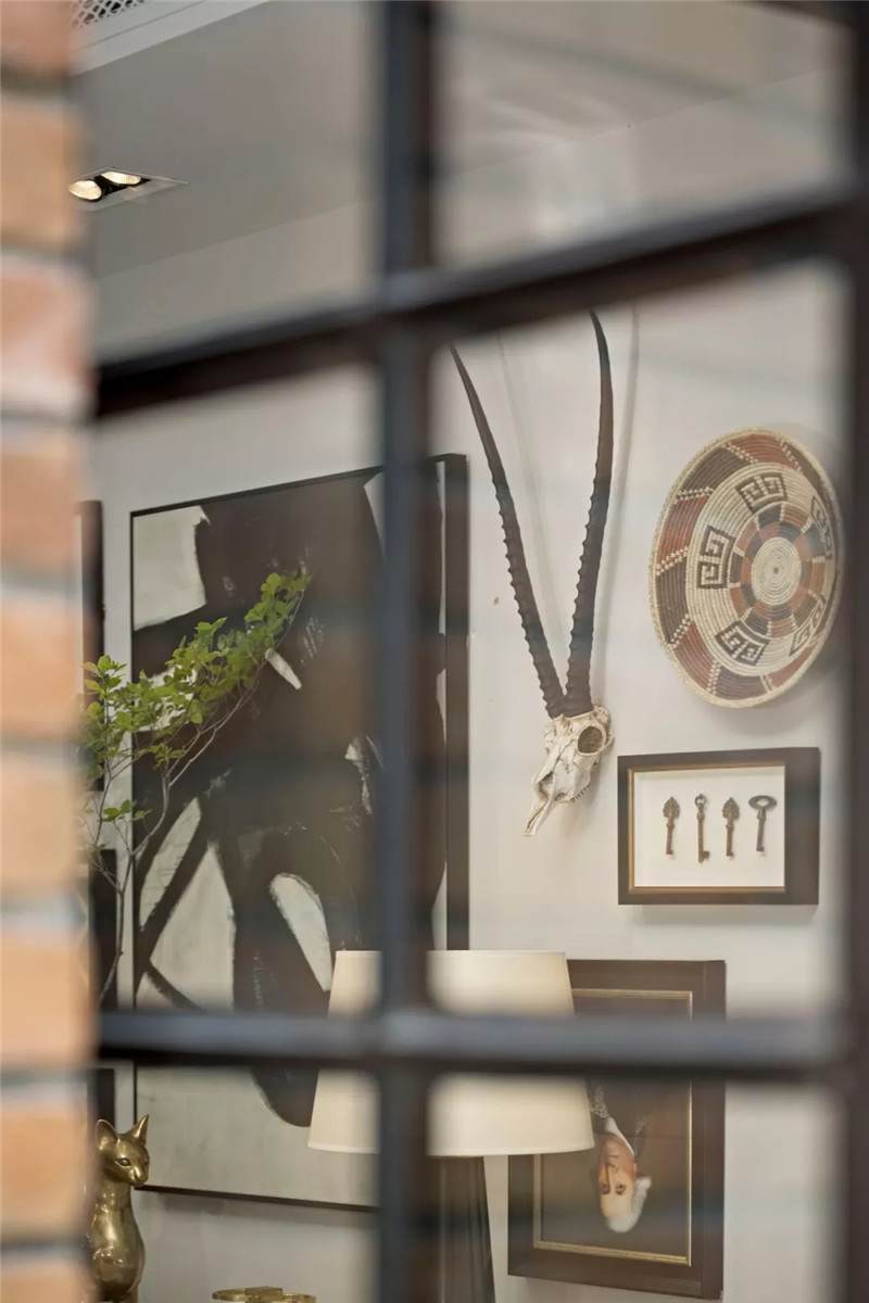 起居室背景展示墻,以混搭風(fēng)格鋪陳出洛普普的敘事展現(xiàn)。原始的羚羊頭飾,彷若征服野性蠻荒,象征勝利光輝。鑰匙是正在延續(xù)著的權(quán)勢標(biāo)志。設(shè)計(jì)師用跳色的編織盤與抽象藝術(shù)畫將微量的彩色疊加進(jìn)黑白灰的間隙中,呈現(xiàn)出別樣、細(xì)膩的風(fēng)情。而左下角的守護(hù)貓,一如埃及傳說中神秘的幸運(yùn)守護(hù)者,正看顧著明亮通透的窗外,不斷朝曦夕映的美好時(shí)光。
