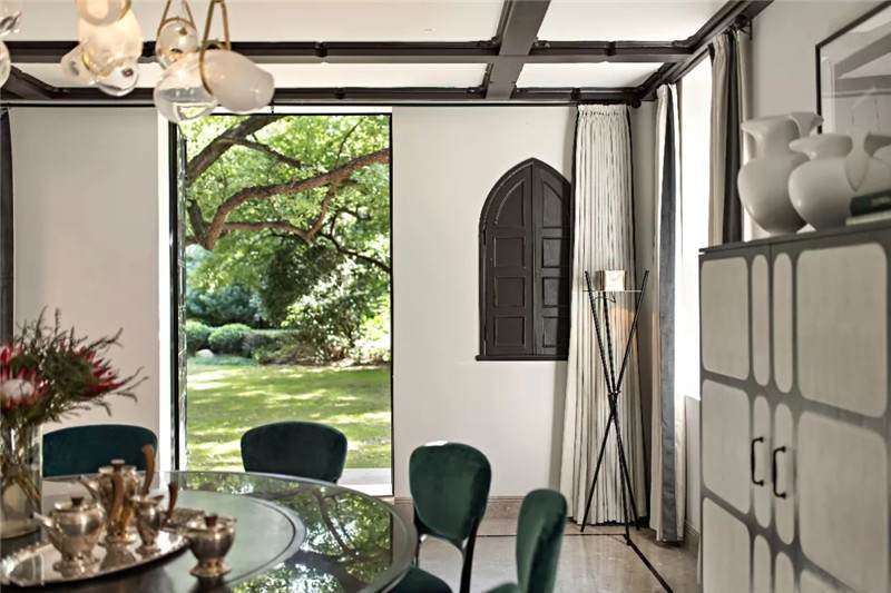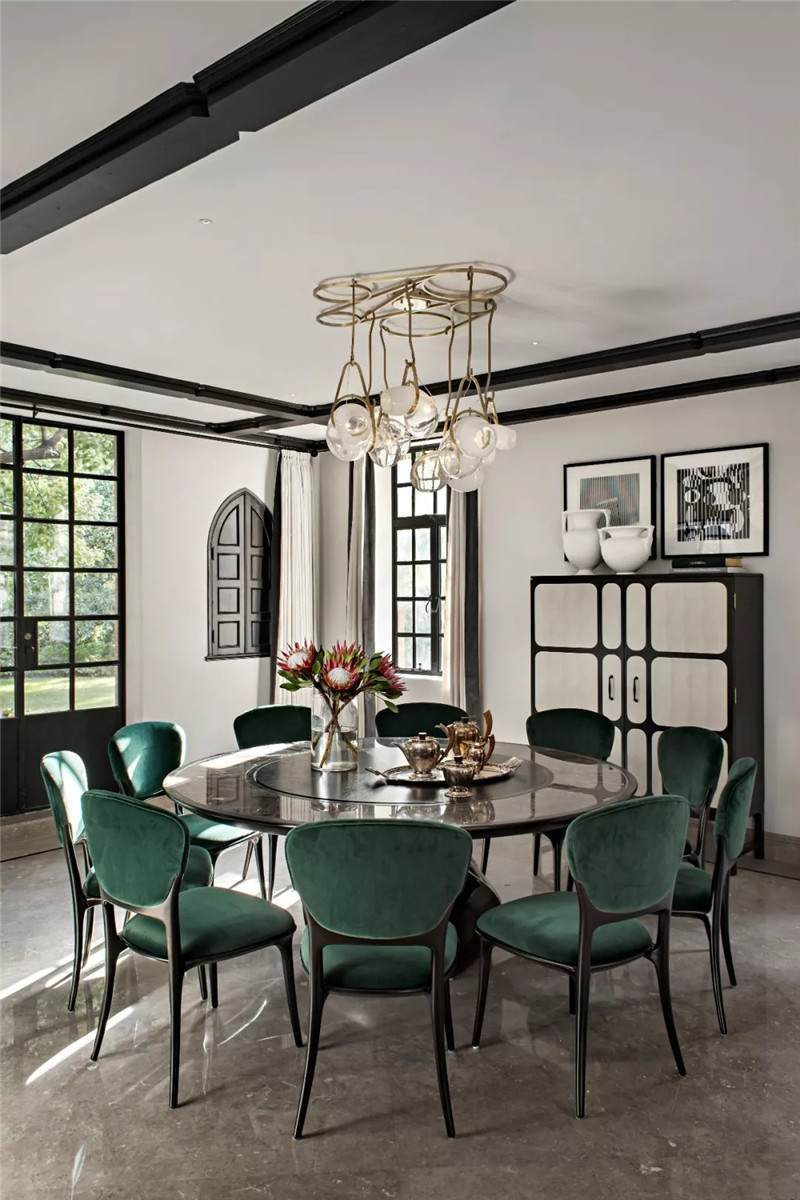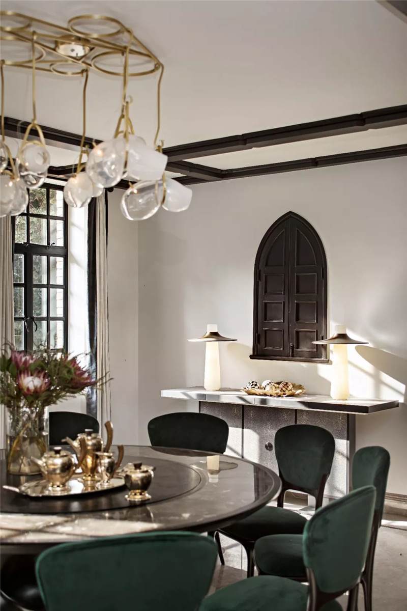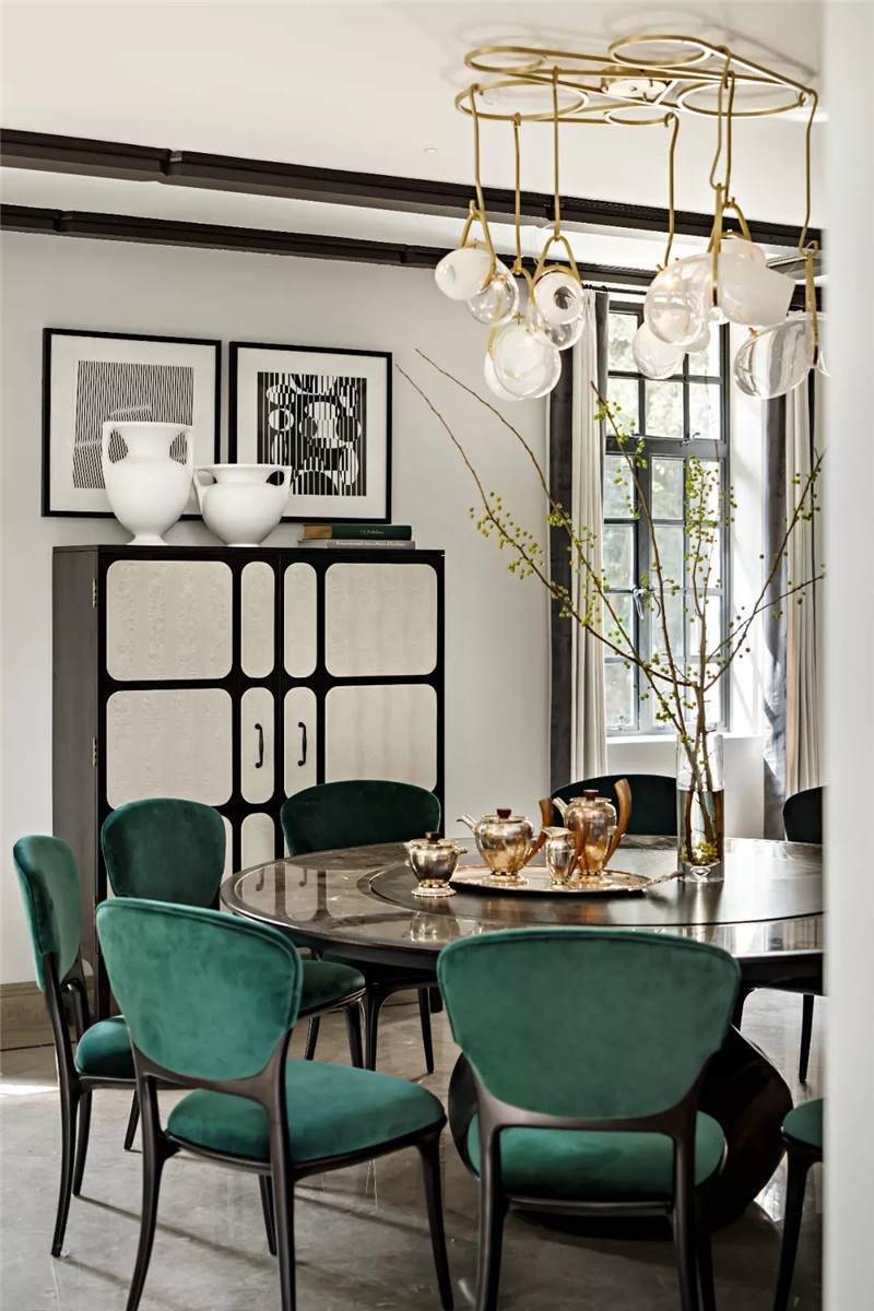 設(shè)計(jì)師在開放式餐廳匯入尊貴的墨綠色,這也是拉斐爾前派畫家但丁·加百列·羅塞蒂畢生鐘愛的顏色。它溫情而清醇,神秘中帶著些許明朗,似幽深林間漫溢出的一屢清泉,在海派復(fù)古格調(diào)中自在游暢。