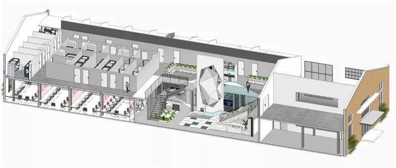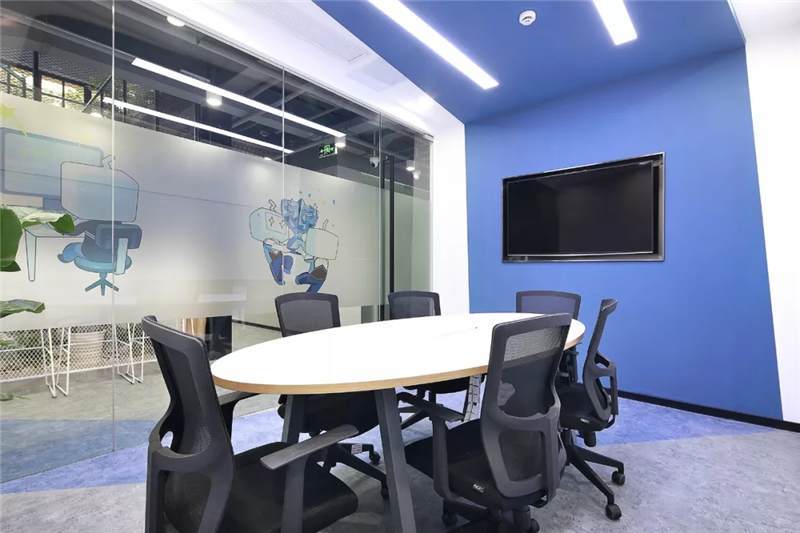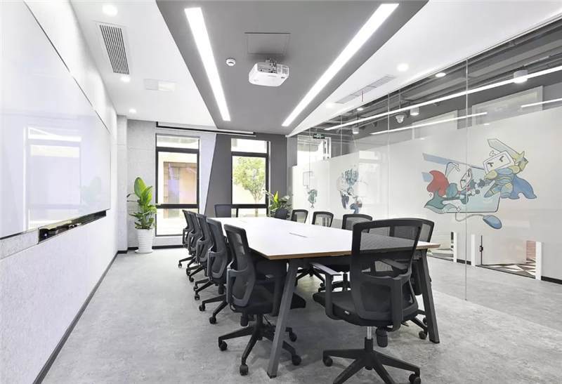 開放辦公區(qū)主體用大量的白色,更加干凈、簡潔;頂面燈具使用粉色,與其他區(qū)域相呼應;地面采用兩種地膠拼接,也使得空間更加有層次感。大小不同的會議空間設計,運用了天花到墻面再到地面的連貫造型,增加整個會議空間的靈活性。