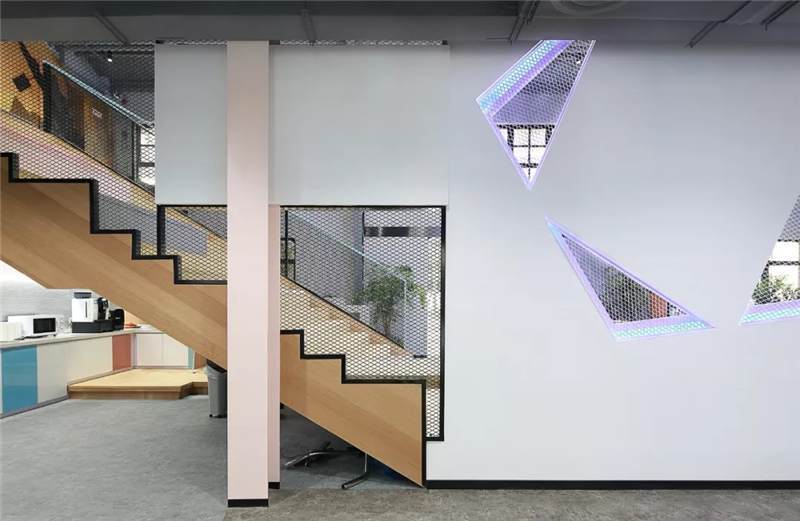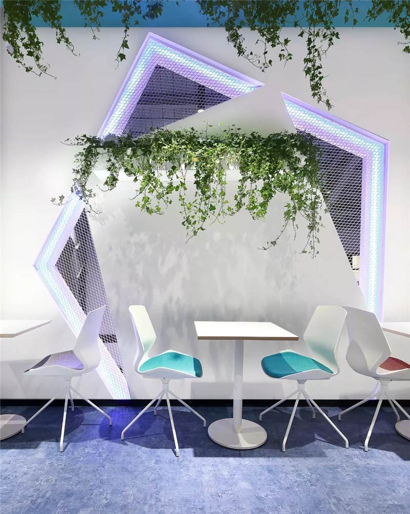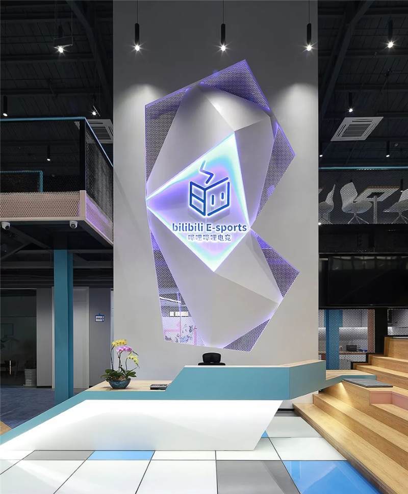 前臺接待區(qū)利用建筑結構挑空空間的優(yōu)勢,塑造9米高的具有未來雕塑造型藝術感的LOGO背景墻,結構形態(tài)上,設計師運用B站文化中的創(chuàng)意與元素,中間由三維立體幾何造型與鐵絲網(wǎng)拼接而成,配以藍色燈光,彰顯公司文化的同時呈現(xiàn)電競的科技感,使得整體背景墻,體量和形態(tài)上給往來訪客和員工強烈的視覺沖擊感。