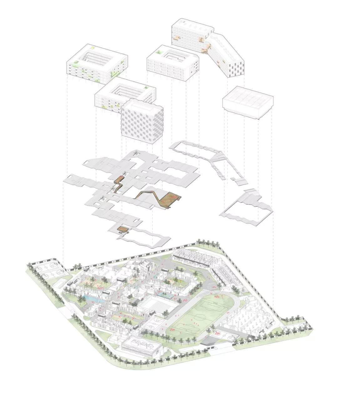 整個(gè)校園場(chǎng)地是一個(gè)呈45度朝向的矩形,建筑密度達(dá)到1.4,遠(yuǎn)超0.8的平均標(biāo)準(zhǔn),場(chǎng)地空間利用非常緊張。如此高密度環(huán)境下的校園建筑規(guī)劃設(shè)計(jì),是一場(chǎng)空間的游戲也是一道數(shù)學(xué)題:通過規(guī)劃的布局最終滿足一個(gè)容積率的等式。解開這道“數(shù)學(xué)題”的同時(shí)又能滿足校園親切舒適的尺度成為了規(guī)劃的核心問題。