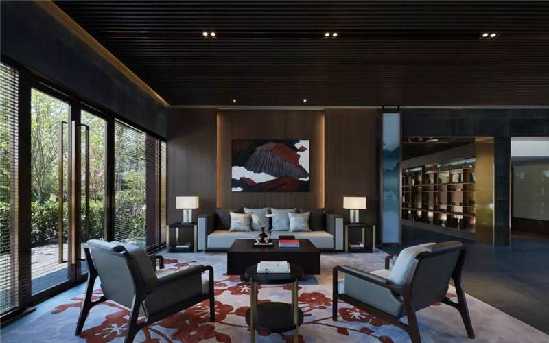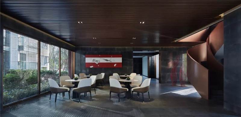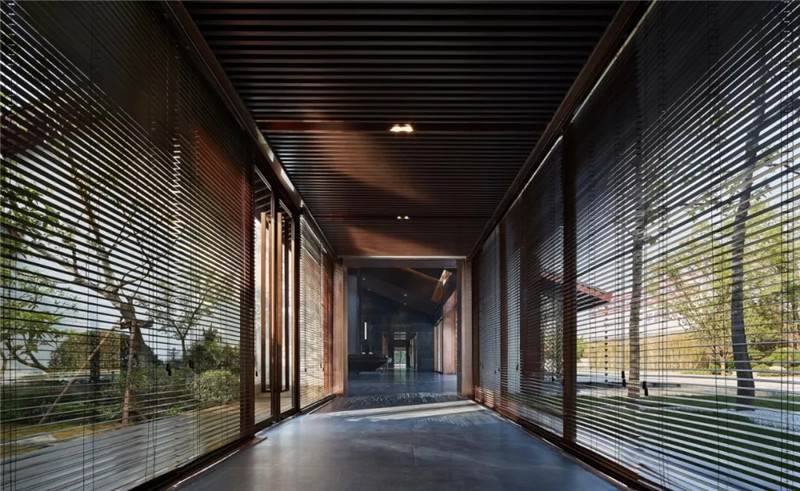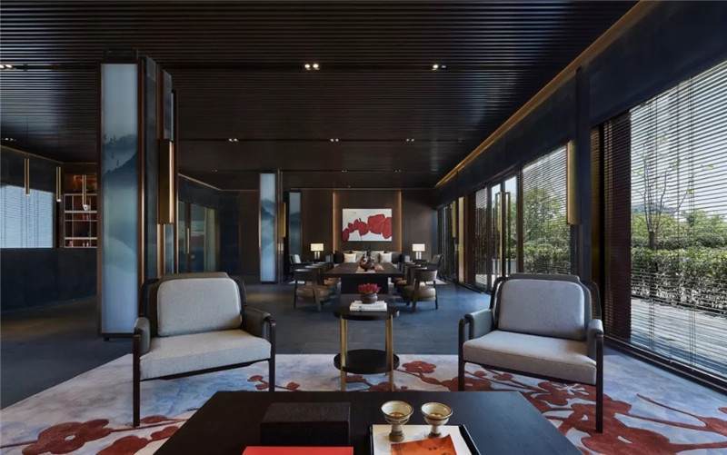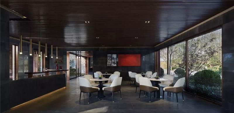 大堂西側(cè),全景落地玻璃及百葉搭配,加以園林框景手法,呈現(xiàn)意境之美、隱隱約約之效。穿回廊而過,便見洽談區(qū),頓時豁然開朗。