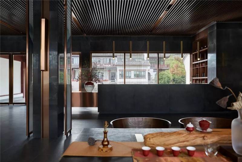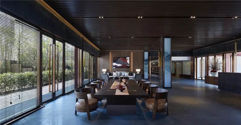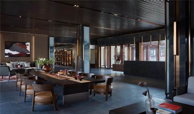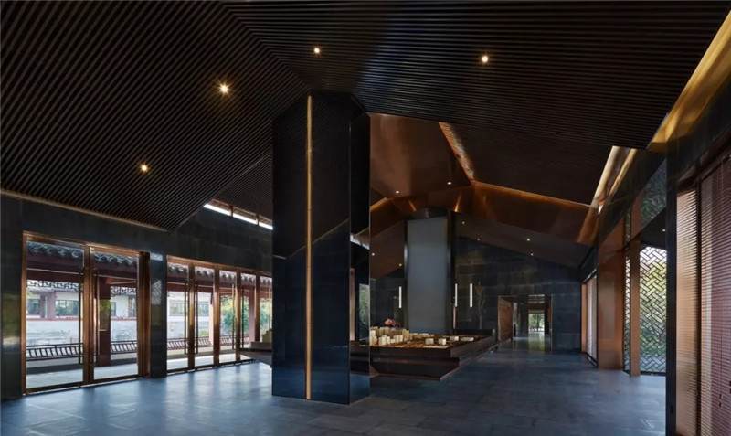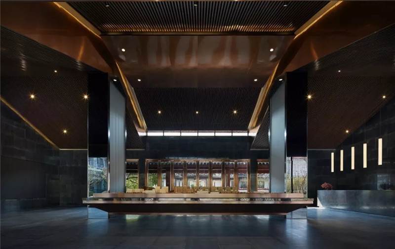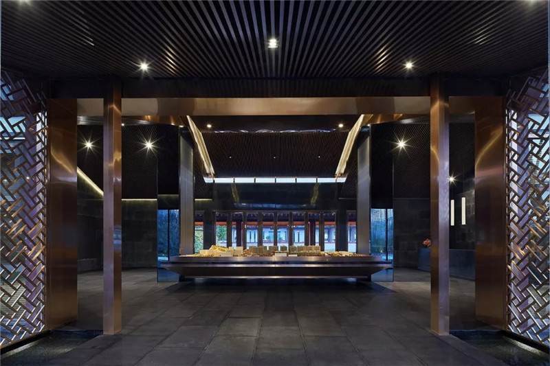 大堂內(nèi)注重材質(zhì)的克制與平衡,大面的黑色基底將儀式感與雄渾氣勢渲染而出。金屬鏤空格柵顯江南韻律,斜屋頂及頂端挑空區(qū)窗口,則是對傳統(tǒng)物態(tài)的解構(gòu)與再造。剝開視覺表象,映射出來的是現(xiàn)代、東方、藝術、自然等內(nèi)核元素,給賓客無與倫比的感官體驗。