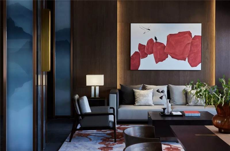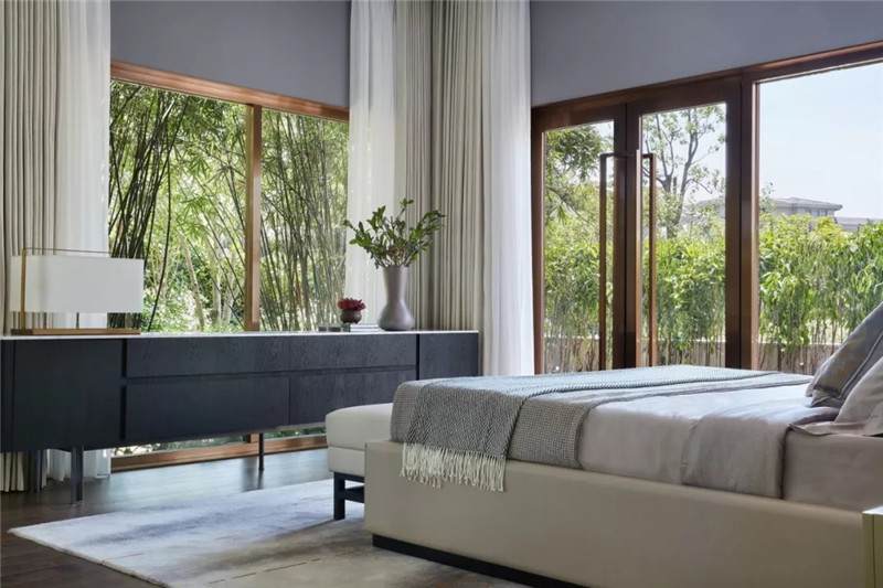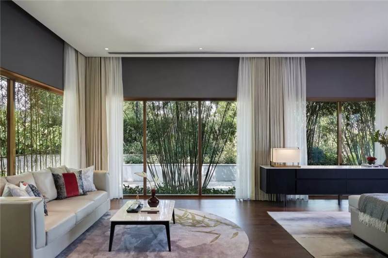 客房套間以現(xiàn)代簡約風范融入自然,呈現(xiàn)安寧愜意之境。設計師賦予其三面環(huán)景的奢享體驗,實現(xiàn)室內(nèi)與自然的對話,物器與光影的互動。