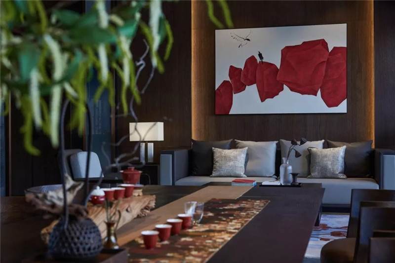 桌面借由點點紅綠添色,打破單調(diào),越發(fā)渲染生機與活力。兩端放置著極富水墨暈染狀的抽象畫作,以厚重的文化底蘊來響應當下的時空與場域。