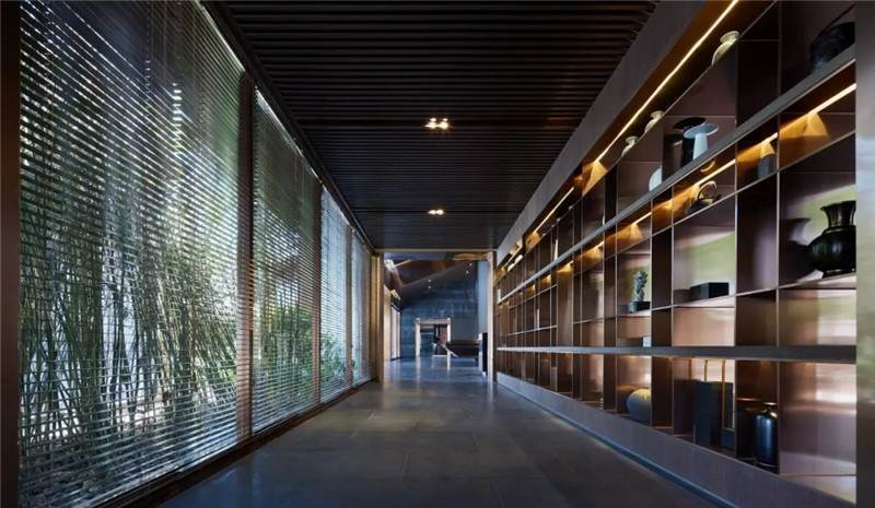 大堂東側(cè),因勢利用通道設置藝術長廊,充沛的線條韻律,靈動的格架鏤空分割,虛實相生互補,氣場也在隨之巧妙切換。