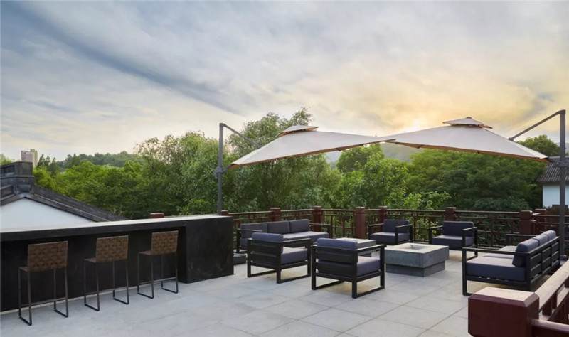 露臺是包廂功能場景向室外的延伸,為賓客提供了聚會絕佳場所。聽風望水、閑看流云,讓人悠然自在,回歸詩意心境。