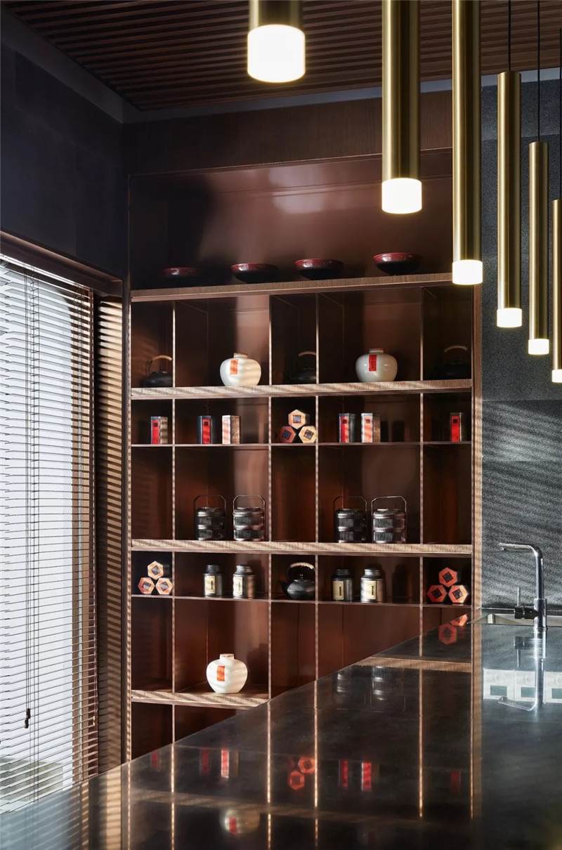 傳統(tǒng)古樸的根雕茶臺、日式絲織茶席,結(jié)合多樣材質(zhì)混搭,鋪展開一室古雅清愜。于此飲茶一甌,以裊裊升騰的水霧構(gòu)就品茗論道的精神棲居。水吧臺與茶室相對,茶文化展示架使用木格與金屬層板相交設置,以其跳躍性突破常規(guī)。