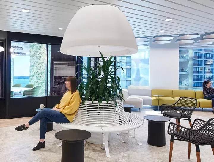 如“起居室”般的非正式會議室,則裝飾以居家般的家具營造舒適的氛圍,透過開敞的落地窗,煙波浩淼的安大略湖的美景盡收眼底,縱目四望,曠達不羈。綠色草皮般的地毯在這里隨處可見。