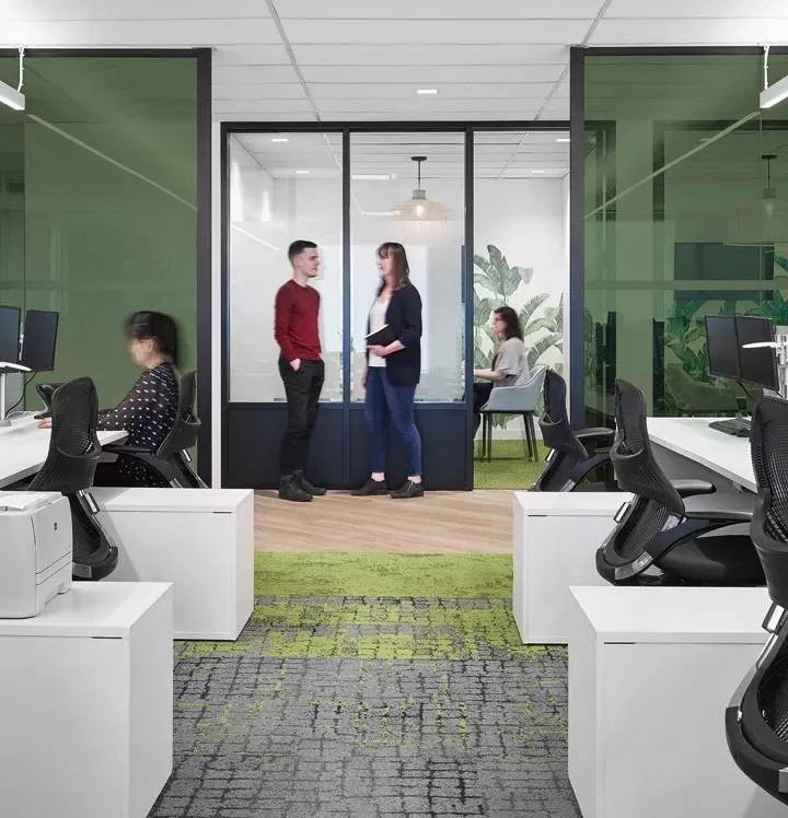 一間正式會議室,墻面鋪滿了綠色棕櫚葉墻紙,并配以綠色扶手軟椅,在綠色清新風中,具有吸音性能的紫色布藝窗簾形成鮮明的色彩對比。毛氈聲學燈具BuzziPleat更是為整個空間錦上添花,帶來美美的視覺。