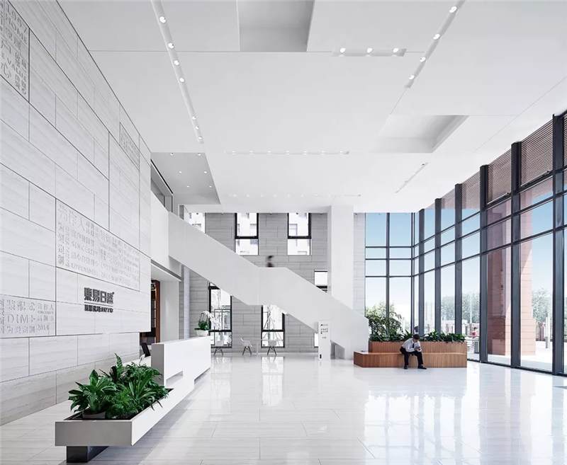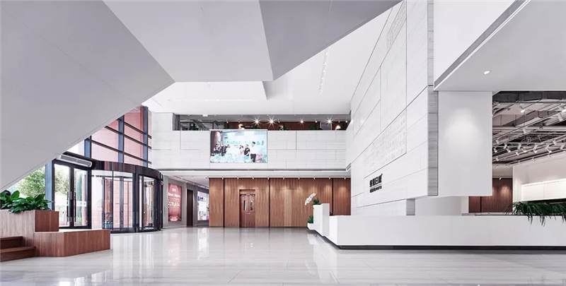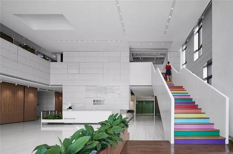 前廳大堂采用高挑空結(jié)構(gòu),用大尺寸純色人造石雕刻工藝打造前臺(tái)及LOGO背景墻,背景墻后設(shè)置墻體與東易日盛高端家裝高科技產(chǎn)品一體化展示區(qū),右側(cè)設(shè)置白色穿孔鋁板樓梯配以彩色階梯直達(dá)二層展廳,樓梯平臺(tái)以木飾面板點(diǎn)綴綠植打造成休憩待客區(qū),整個(gè)大堂接待區(qū)營(yíng)造出現(xiàn)代,開(kāi)放,包容的氛圍。