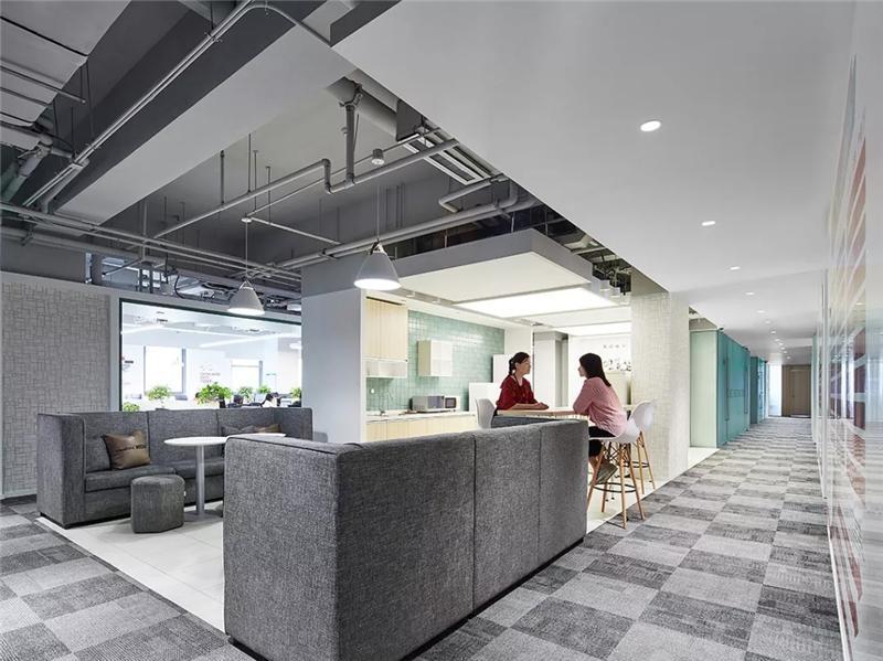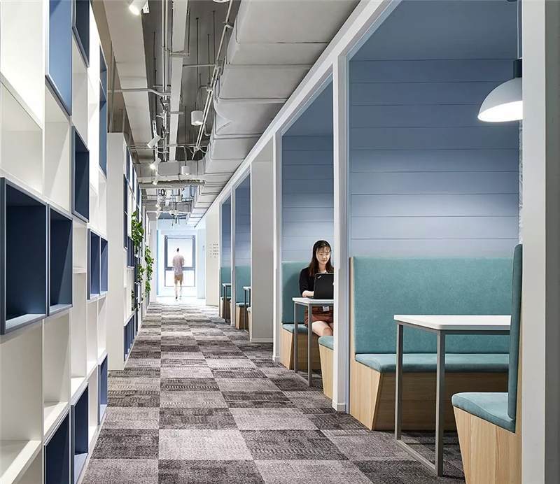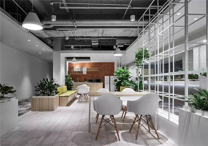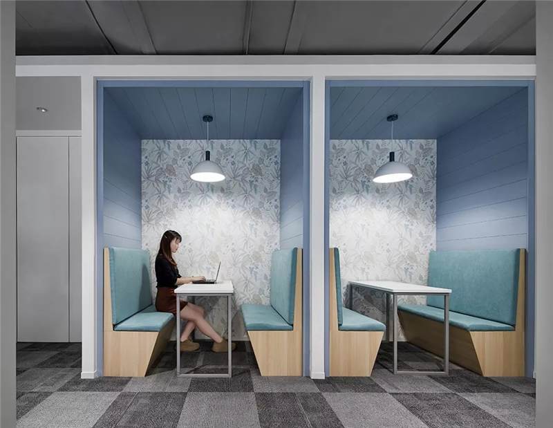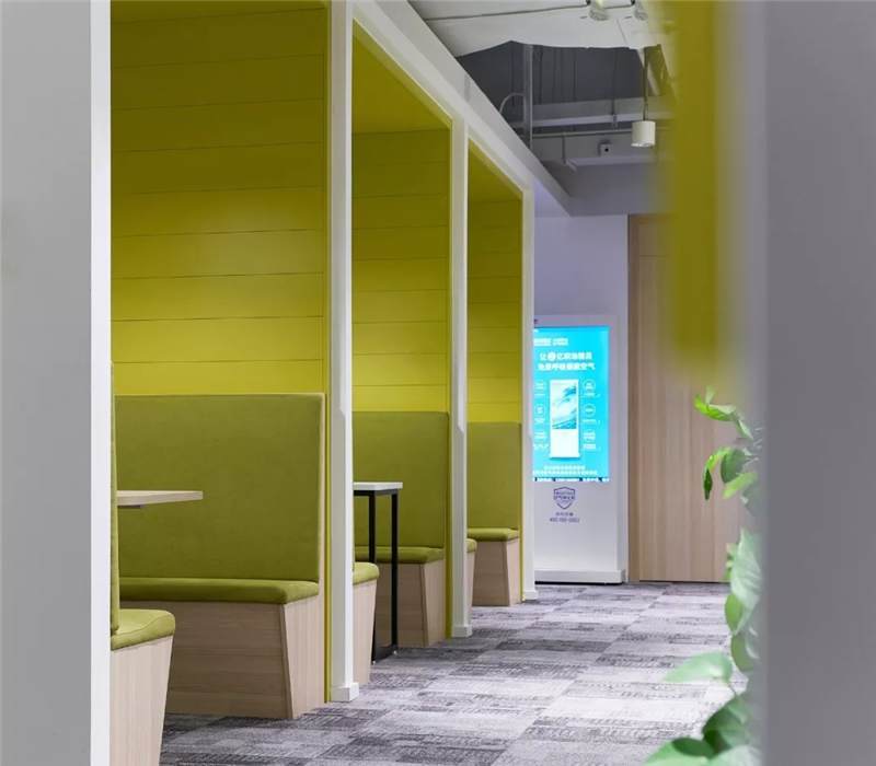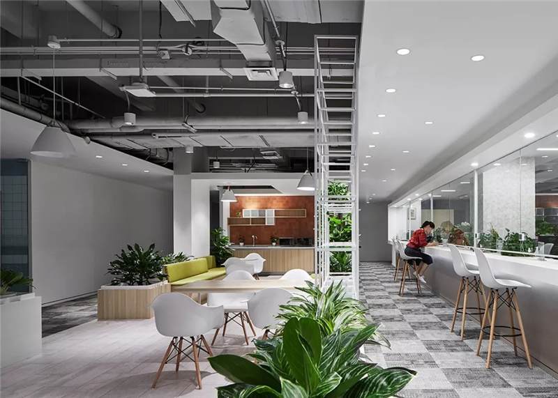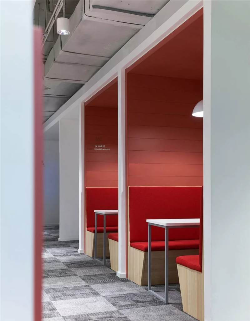 3-6層的各事業(yè)部及旗下子公司辦公層,設(shè)計(jì)師沿著核心筒打造環(huán)形的公共區(qū)域及溝通環(huán)廊帶,依次布置開(kāi)放休憩洽談區(qū),電話亭,小型會(huì)議室,茶水間,衛(wèi)生間,涂鴉板等促進(jìn)溝通交流但界限模糊的混合功能區(qū),并采用卡座,綠植,通透金屬框架,玻璃配以貼膜,墻貼等方式營(yíng)造公共區(qū)域與辦公區(qū)之間的多層次關(guān)系,形成自由穿梭的辦公空間動(dòng)線。