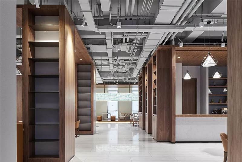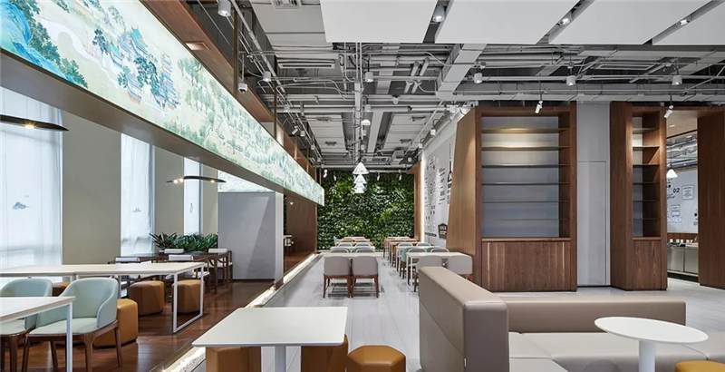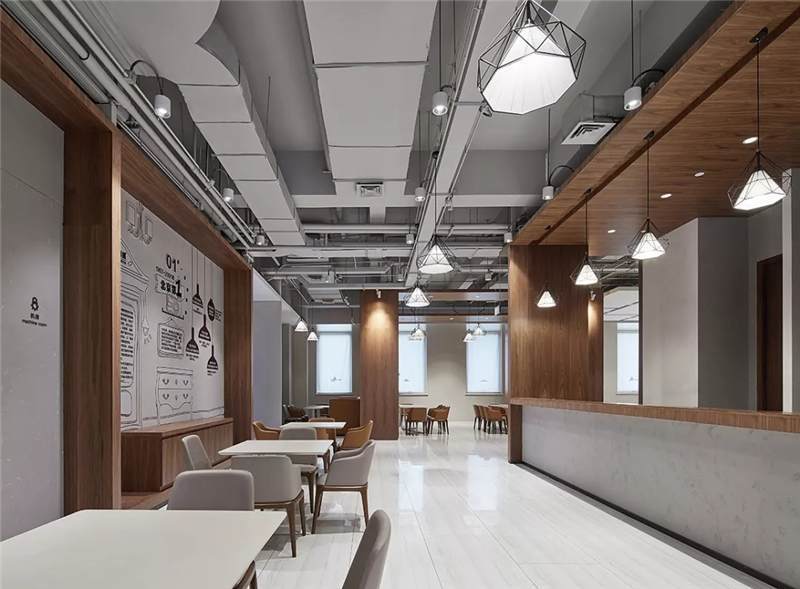 前廳左側(cè)穿越企業(yè)榮譽(yù)展示墻即是咖啡廳和用餐區(qū)。咖色木質(zhì)家具圍合成不同的半私密性空間,黑色幾何線條吊燈及長(zhǎng)條形中國(guó)傳統(tǒng)園林山水飾面燈箱分別營(yíng)造出現(xiàn)代與古典相融的用餐氛圍。