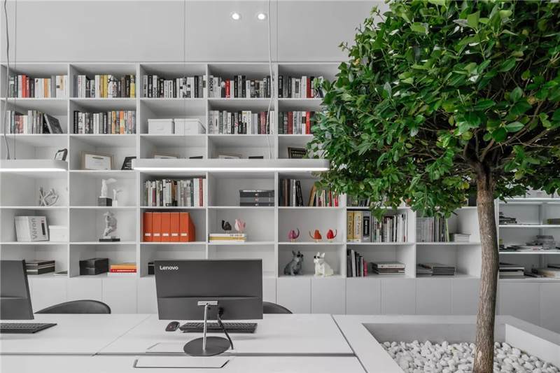 在這里,未知的一切與既有的常識(shí)記憶產(chǎn)生傳導(dǎo),想象思維的觸角開始蔓延。小株綠樹分隔出挑高的白色高座式二人桌,提供了一種更為隨性、更利于面對(duì)面交流的辦公形式。