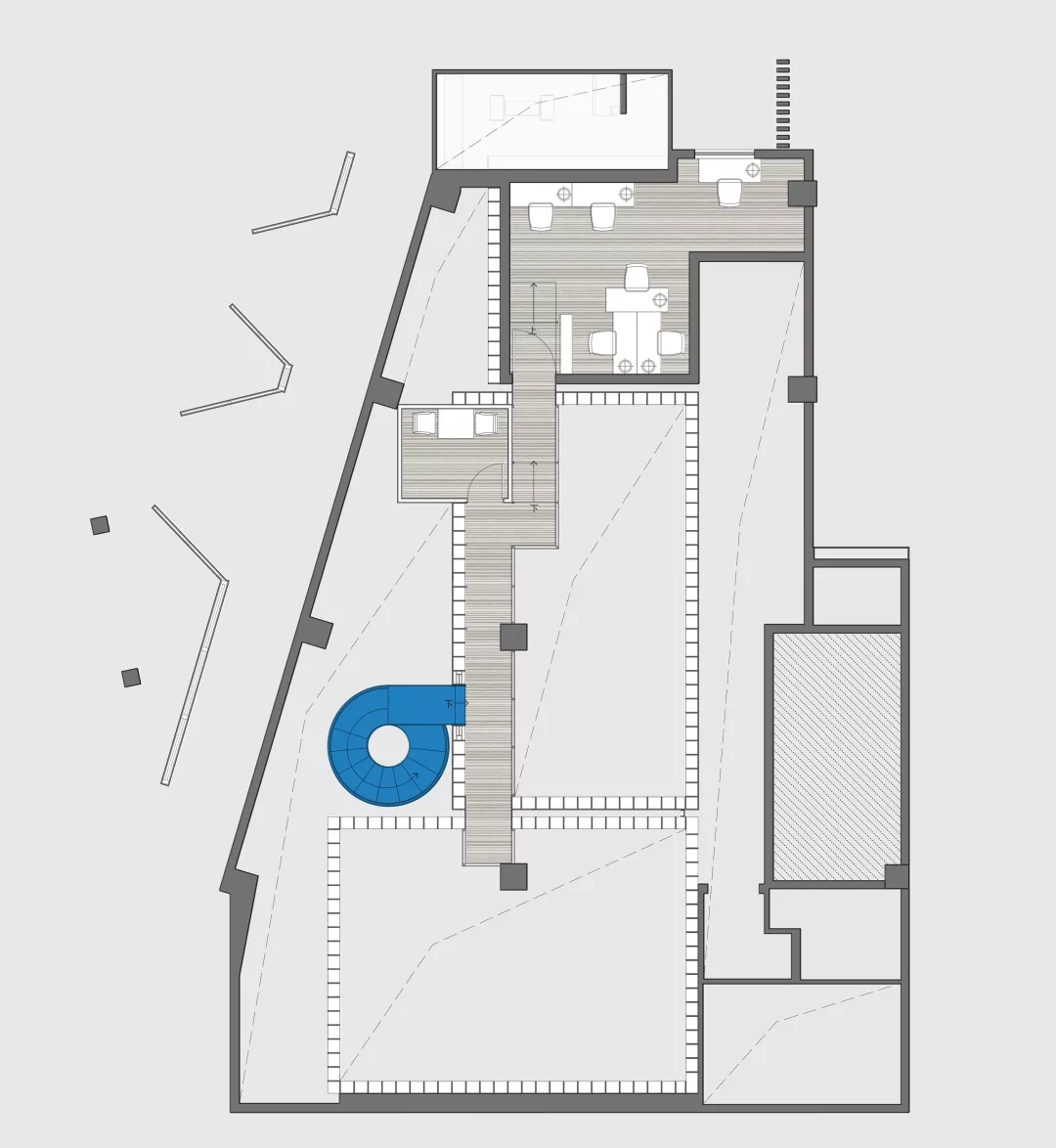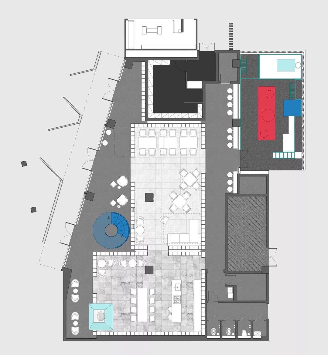 現(xiàn)場是個不規(guī)則的平面,如果排除未來可復(fù)制性,就著形狀設(shè)計并無不可,但這就缺乏了示范性意義。設(shè)計師按照客廳研究成果,在這個不規(guī)則平面最大極限設(shè)置了三個盒子,一個是功能性的,一個是社交性的,一個是女性的。如果把不規(guī)則的場地看成是一座城,這三個盒子就是內(nèi)城,而他們之間不規(guī)則的剩余空間可以自由定義的場所。