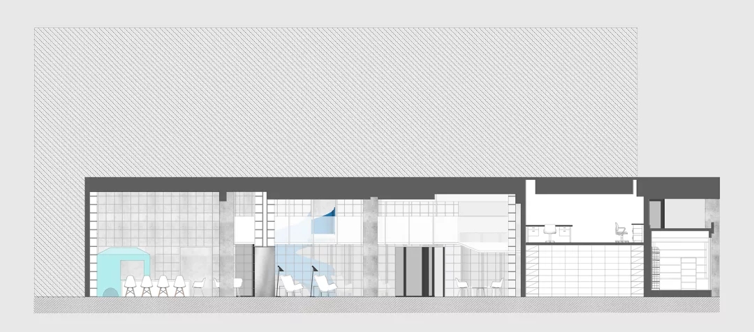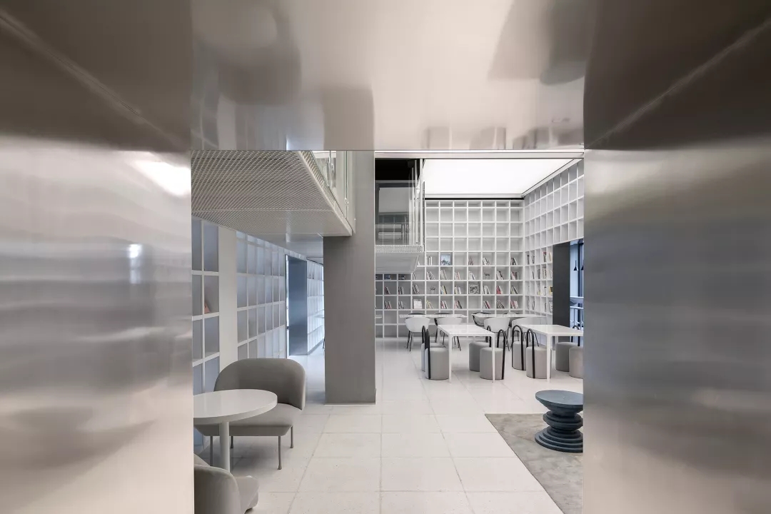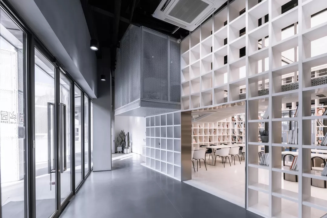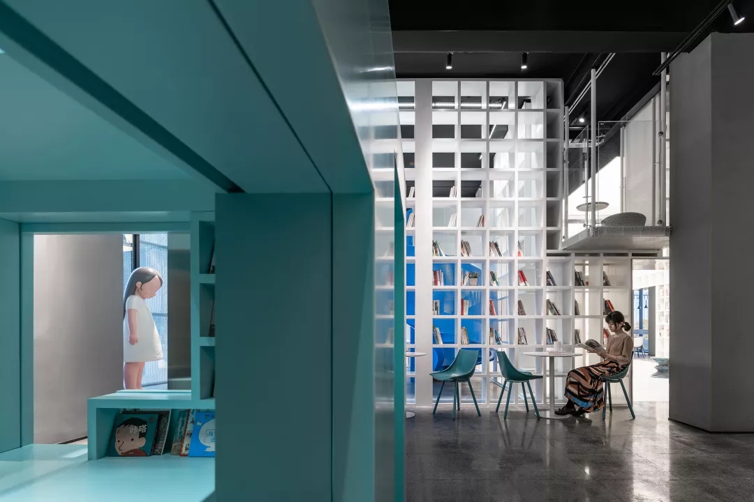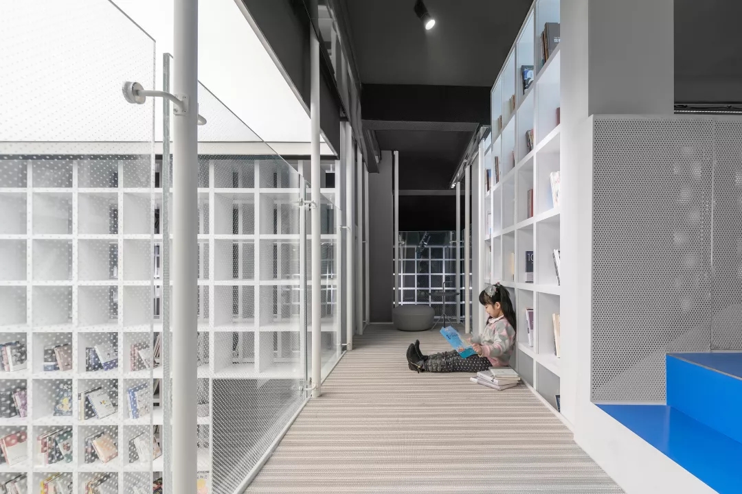我用蒂芬妮藍閱讀屋作為女性盒子的中心,與此呼應(yīng)的是入口可見的卡萊茵藍螺旋樓梯,以及盒子背面室外的明黃色兒童活動場地。他們精致地鑲嵌在有些迷離模糊的空間中成為點睛之筆。如果社區(qū)客廳藏在陳詞濫調(diào)的商業(yè)里面之后,就失去了示范作用。有空客廳的立面就是一個打開的盒子,高4米的半開門是穿孔鋁板制作的,形成了Wutopia Lab標志性的半透明界面。你能從這里隱隱約約的窺看到,溫暖的燈光,明亮的藍色,和孩子的笑聲。