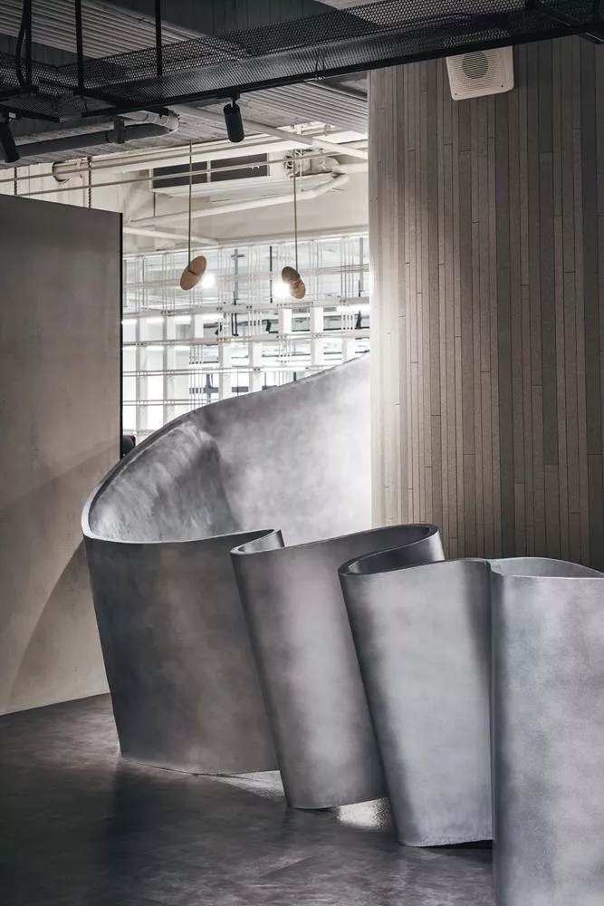 創(chuàng)意是無限,沒有邊界的。是一條線、亦是線聚集轉(zhuǎn)化而成的曲面。直線,是思考的軌跡。曲面,是每個創(chuàng)作的轉(zhuǎn)折,線條的動靜之間,串聯(lián)了空間,刻意保留基地原貌的原質(zhì)肌理,植入了新的設(shè)計元素,呈現(xiàn)粗曠和細(xì)致的沖突美,來表達(dá)品牌精神:前衛(wèi)、年輕、精致、優(yōu)雅。充滿雕塑感的柜臺,佇立于公共空間中充滿風(fēng)采,勾勒新穎且醒目的企業(yè)形象。