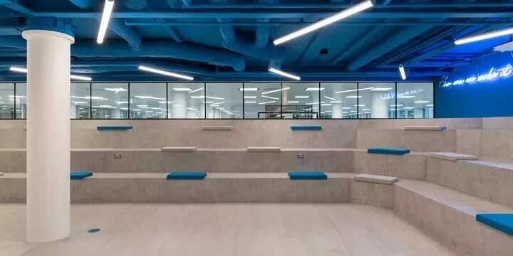特點(diǎn):科技,總部、英國、斯堪的納維亞設(shè)計(jì)風(fēng)、寧靜自然簡約、灰色、藍(lán)色頂面、水泥質(zhì)感、看臺式階梯座、車廂座、玻璃隔斷