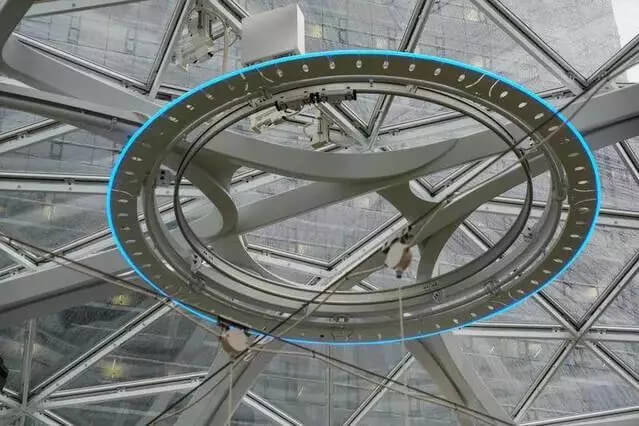 Spheres鳥(niǎo)瞰圖 The Spheres 由三個(gè)玻璃球狀建筑物組成,最大的球體高 90 英尺(約 27 米),寬 130 英尺(約 40 米)