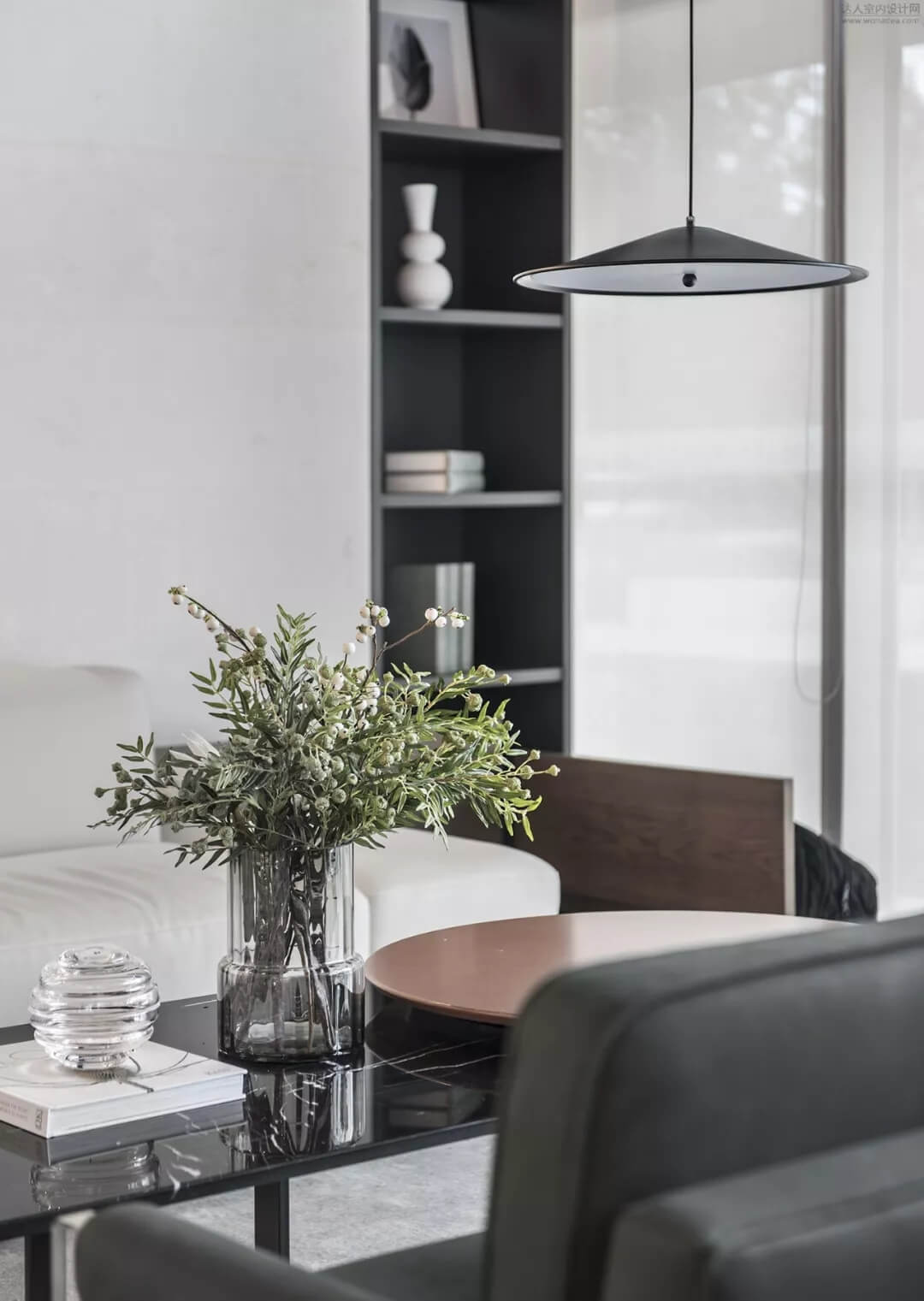 尊重木質的肌理美感,熟諳工藝,亞克力材質包裹的木質年輪,如同凍結了時間的流逝,守住這一刻的永恒。簡潔的質感綠色皮質沙發(fā)予以低調的奢華,同色系的植被增加了空間層次感。