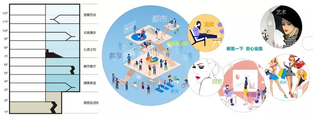 在此理念和品牌屬性的影響下,艾迪爾設(shè)計(jì)師布局辦公和診療空間,傳達(dá)出“舒適溫暖,積極自信,時(shí)尚藝術(shù),活力陽光”的氛圍。因此在大廳布局“美麗生活館”,建筑南側(cè)每兩層設(shè)計(jì)成不同主題的公共空間。