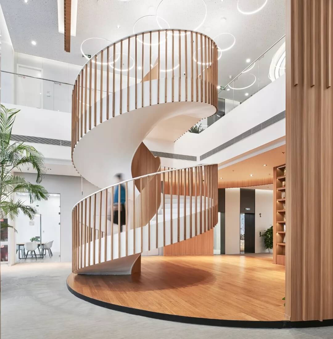 美麗生活館中最矚目的是兩個(gè)圓柱體空間模塊,一個(gè)是貫穿1-2層的木格柵旋轉(zhuǎn)樓梯,半開半包,與咖啡館及接待臺(tái)合嵌為一體,溫馨,時(shí)尚,樓梯的內(nèi)側(cè)展示新氧的榮譽(yù)勛章;一個(gè)是透明的柱狀空間,以靜態(tài)裝置的方式展示新氧文化,周圍布置洽談交流座椅;大堂南側(cè)用文化墻隔出開放的休閑洽談區(qū)和面試及收發(fā)室的圍合空間。