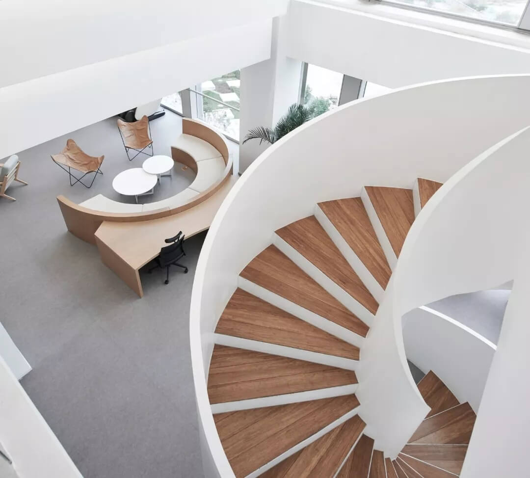 都市客廳島,選擇流暢線條的螺旋樓梯貫穿上下,運(yùn)用條形面板錯(cuò)縫排列成弧形的照明方式,使整個(gè)空間照度均勻,且條形面板亦可作為裝飾展示面。家居軟裝選用極簡風(fēng)格,流線組擺方式,營造自由靈活的空間,促進(jìn)員工間的交流和溝通。