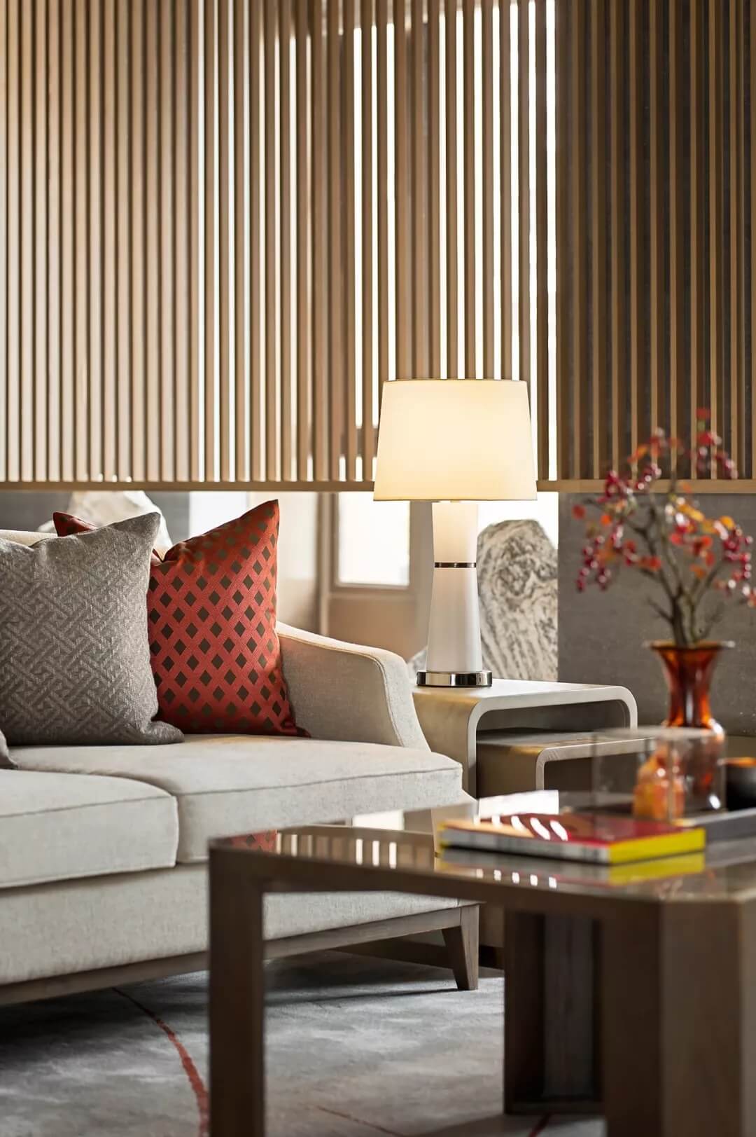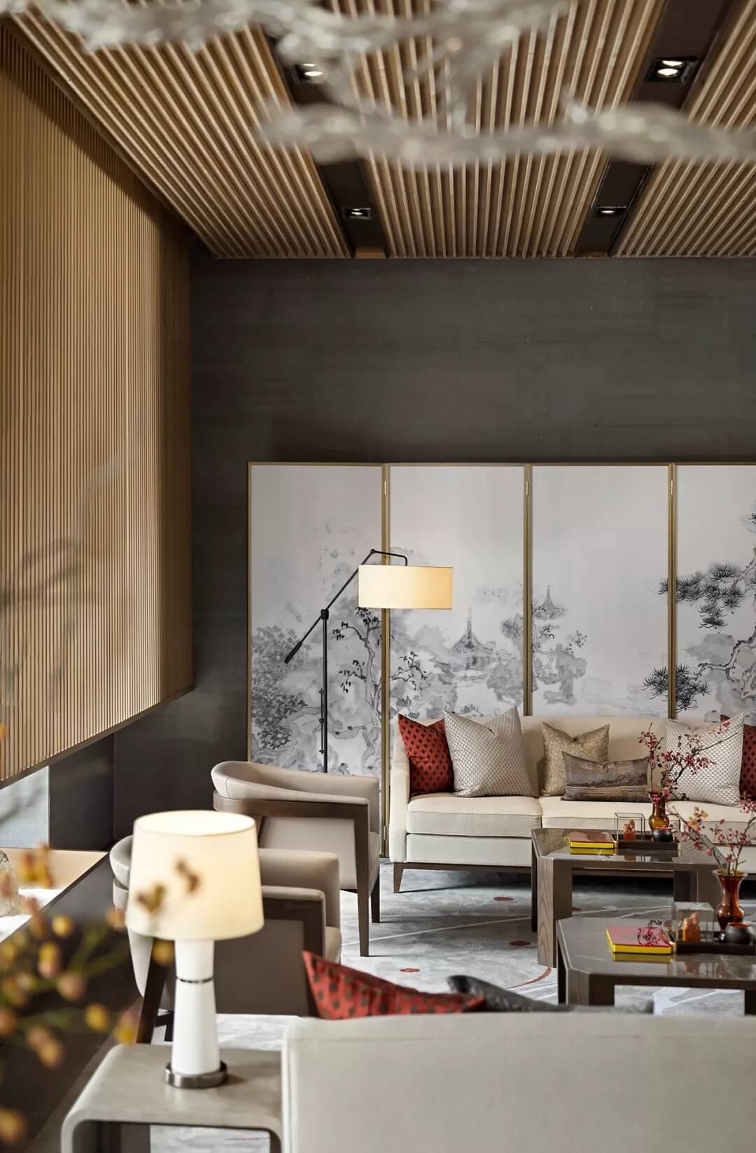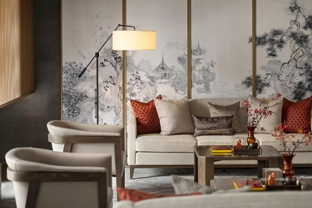 屏風上“高山流水遇知音”,宛如在娓娓道來伯牙子期當年的故事。收藏級裝幀叢書,代表禮儀身份的印章,抱枕上的祥云、山水刺繡,細致精巧的陳設(shè)烘托出文人雅趣,同時營造了沉穩(wěn)靜逸的氛圍,堅定地表達了現(xiàn)代東方的美學(xué)態(tài)度。