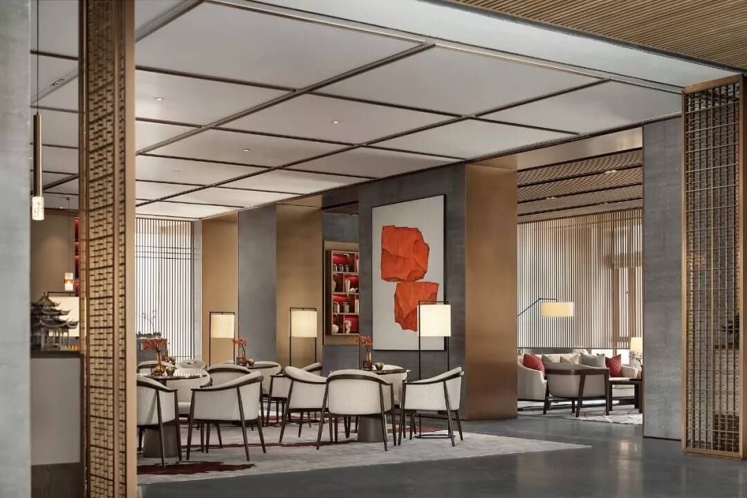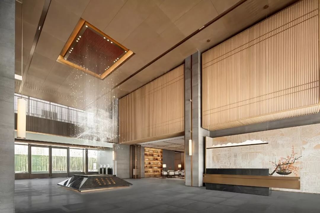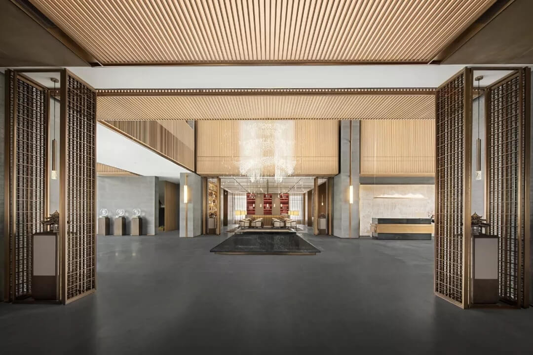 踏入第一重空間的迎賓前廳,大堂挑空高7.7米,氣勢恢宏。“甲第者以禮為官也,不學(xué)禮,無以立。”為此,迎賓區(qū)的設(shè)計干練簡潔,以飽含的禮儀序列拉開整個空間的序幕。