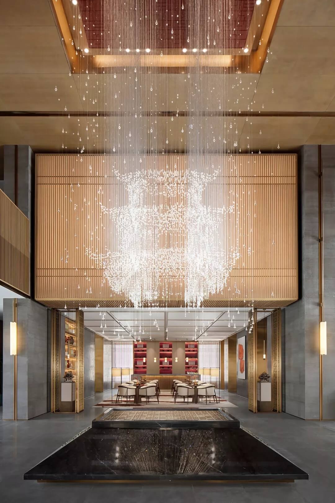 最中心處的藝術(shù)裝置,同樣提取甲第官宅設(shè)計原型,共計7500根透明細線、20260顆不同形態(tài)大小的水晶顆粒串聯(lián)而成。通透閃爍著藝術(shù)和文化的智慧之光,勾畫出屋檐的靈動巧妙,凸顯古代建筑的柔美,也體現(xiàn)出甲第官宅的震撼氣勢。