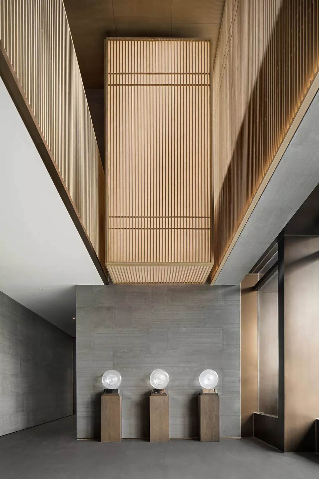 后廳兩端藝術(shù)裝置呈矩陣對稱分布,延續(xù)了古老東方的嚴肅審美。在材質(zhì)多元的形態(tài)下,又極具層次變化。