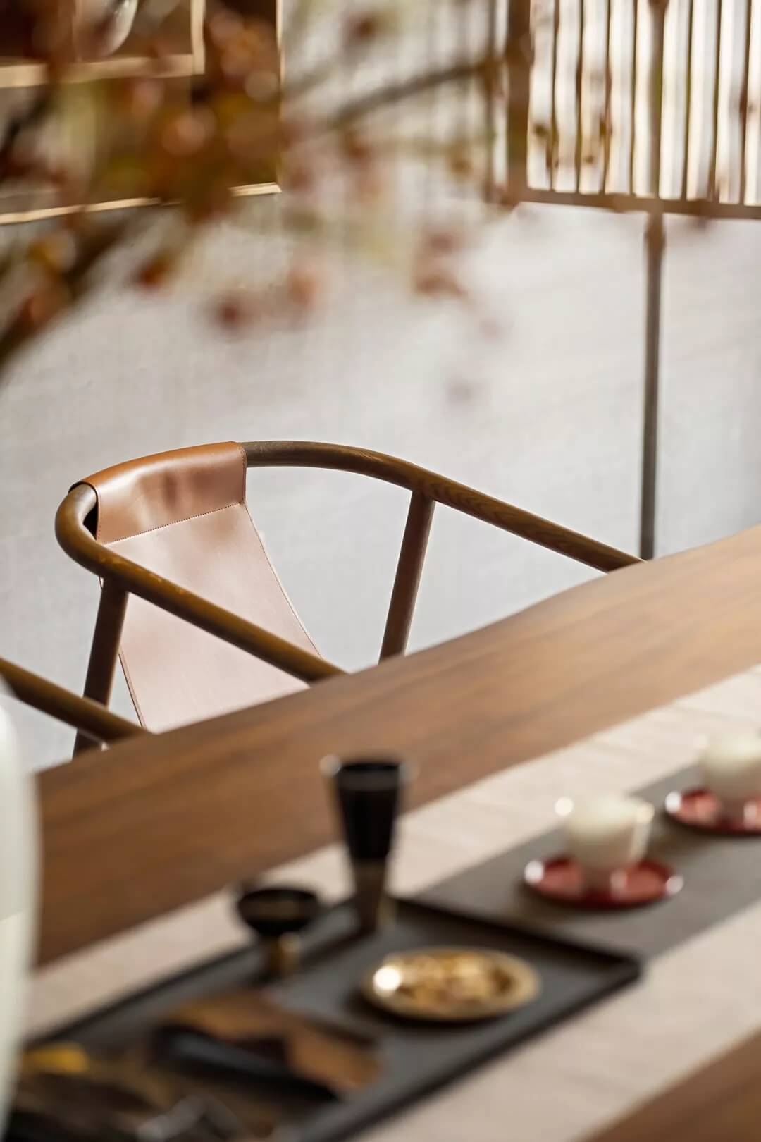 淺度洽談區(qū),左右對稱,尊崇禮制,門洞與展示格架大小相同且彼此對應(yīng),頂部同樣為印章輪廓組合而成,讓水吧臺背景退到最末端,譜寫一場深與淺、光與暗、近和遠的和諧奏鳴曲。在陳設(shè)上則精心擷取了具有通透質(zhì)感的琉璃,古典的造型,質(zhì)樸的色澤,都恰到好處。