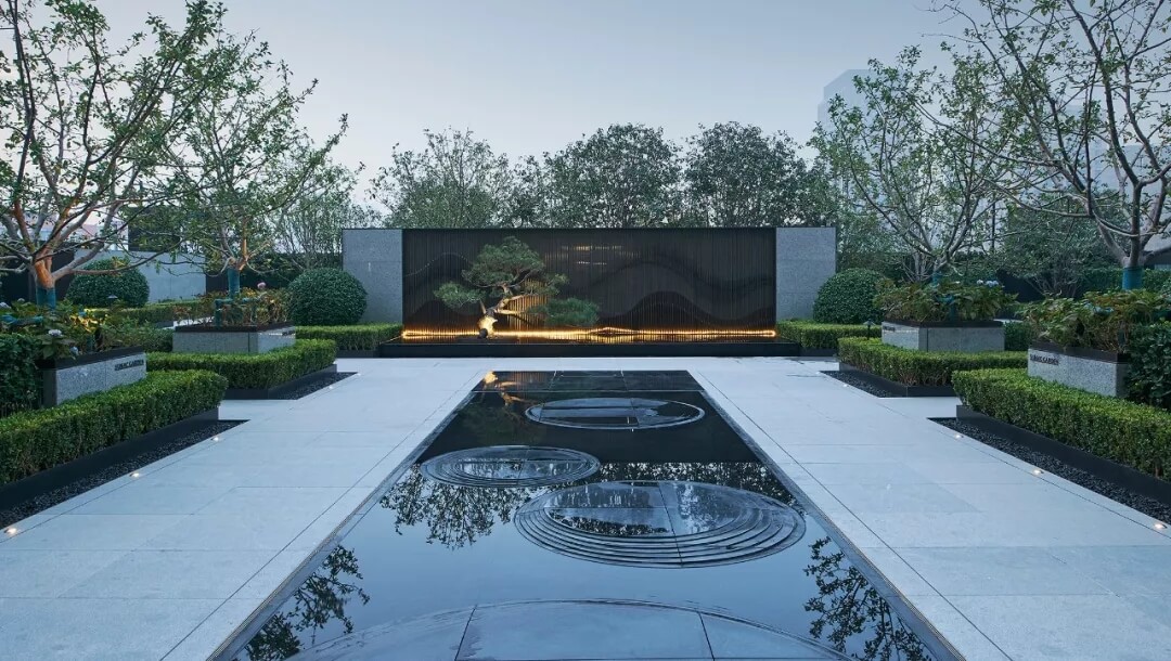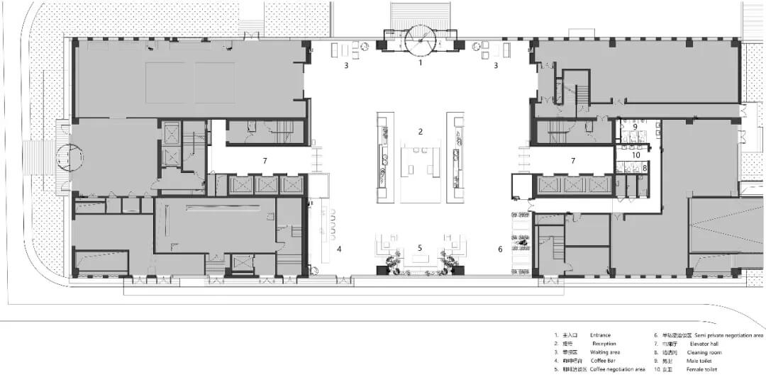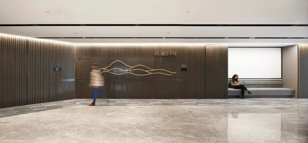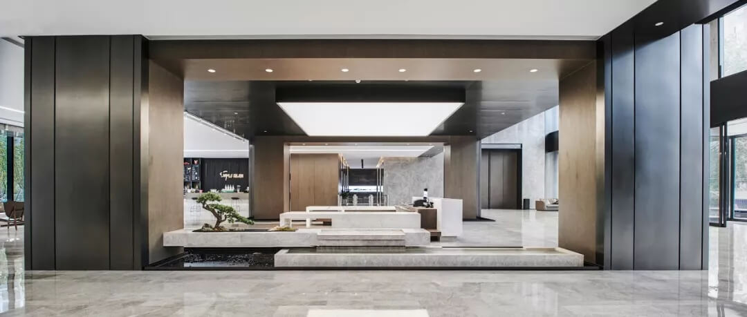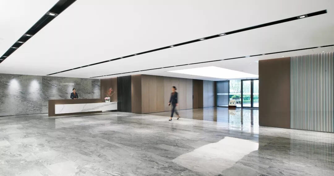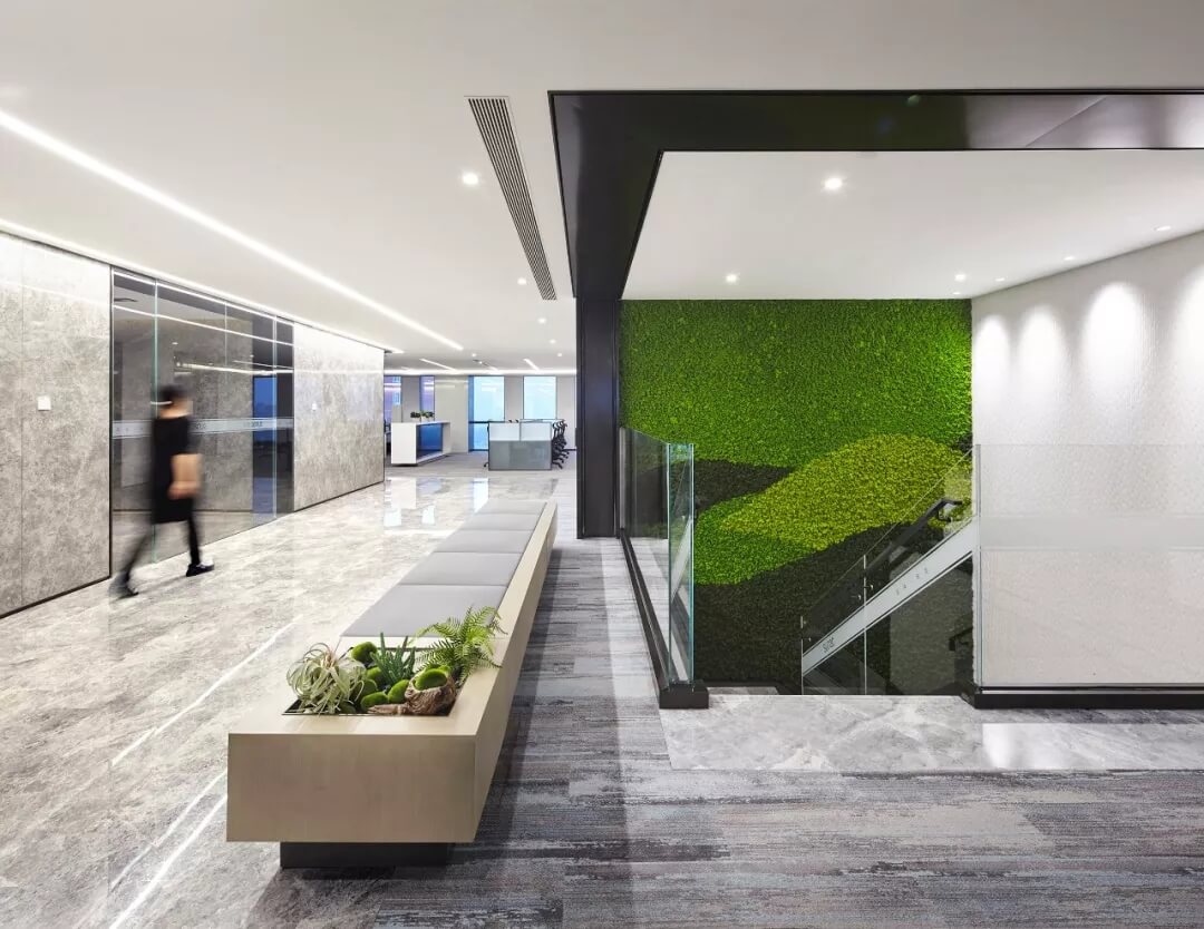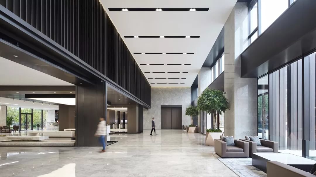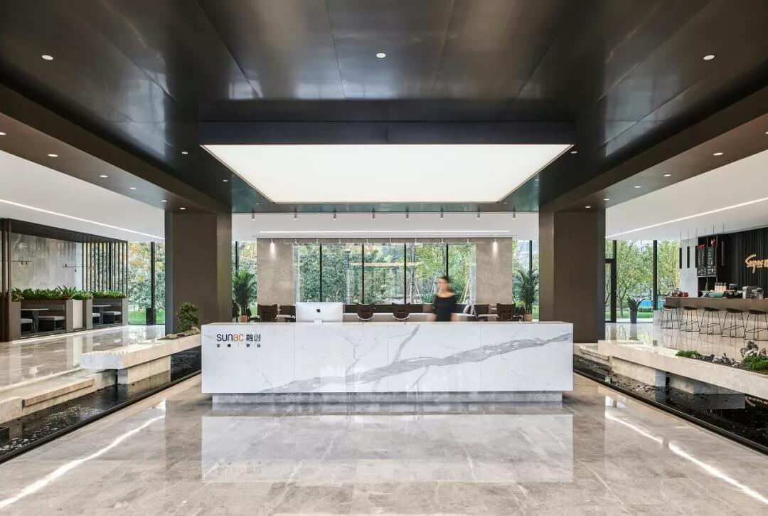 大堂是開放,通透,自然的園林式空間,自成一片天地。踏入大堂即可看到前廳接待島,方形四面通透的造型,嚴謹不失靈活,結(jié)合流動水景和盆景,營造了生態(tài)的,四季怡情的綠色辦公。電梯廳出入口在接待島兩側(cè),實現(xiàn)快速集散,避免上下班高峰期等候擁堵??Х鹊群騾^(qū)玻璃窗形成框景,把室外花園內(nèi)的四季變幻,自然元素都納入到室內(nèi)來,形成情景共融。