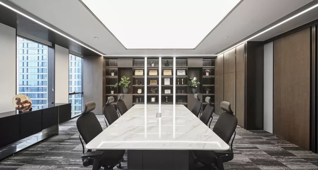 設(shè)計師綜合融創(chuàng)的不同會議使用訴求以及原建筑結(jié)構(gòu),在空間布局上,打造核心筒混合會議帶,不同大小、不同形式的會議空間嵌套在每層開放辦公區(qū)的不同位置,滿足多元化會議需求;卡座,開敞洽談區(qū),休閑洽談區(qū)滿足互動交流,頭腦風(fēng)暴式會議需求。多層次多功能的交流會議由智能系統(tǒng)高效管理,體現(xiàn)融創(chuàng)開放、包容的企業(yè)文化。