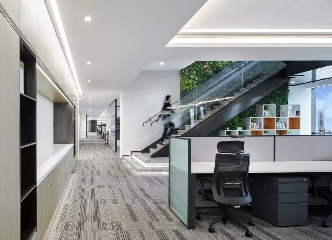 步梯采用極簡折轉(zhuǎn)的造型和玻璃材質(zhì),每層的樓梯區(qū)結(jié)合景觀設(shè)計,聯(lián)通電梯入口,茶水間,設(shè)置景觀小品,圖書閱讀空間,洽談卡座,等候區(qū)等,形成辦公空間的共享交流區(qū)和創(chuàng)意生活區(qū),打造有活力,展示性強的員工休閑活動區(qū)。