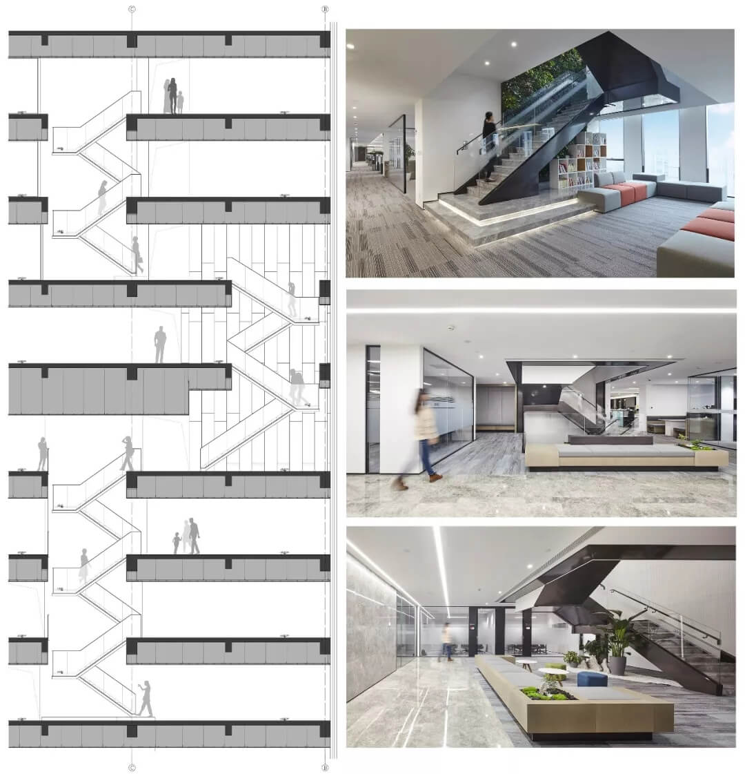 4-11層打通局部樓板增設(shè)步梯,增加吹拔空間,巧妙的貫通上下層空間,加速空氣流通,使空間更加靈動透氣,減少空調(diào)使用量,同時也使各部門聯(lián)系更便捷,溝通更高效 。