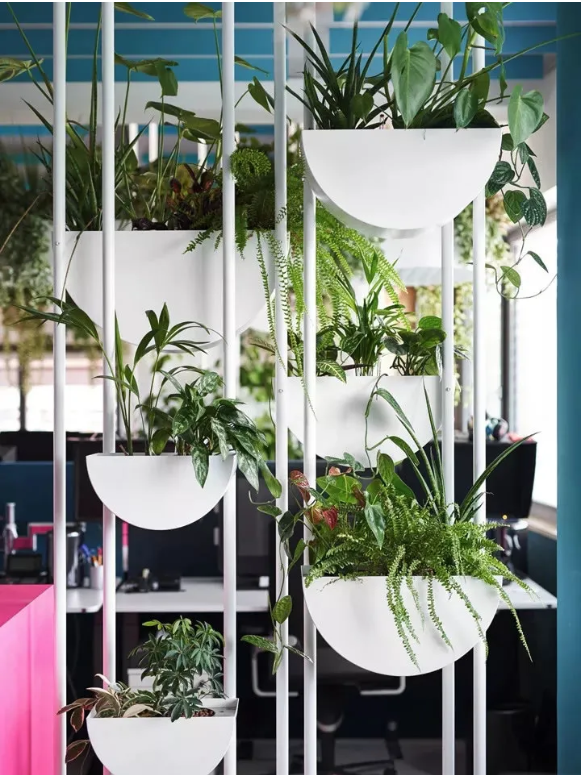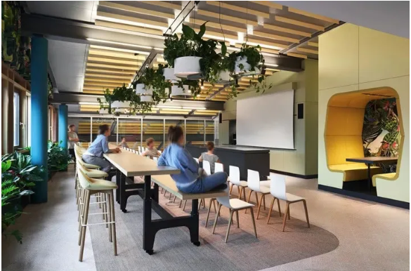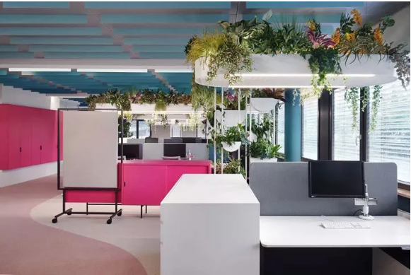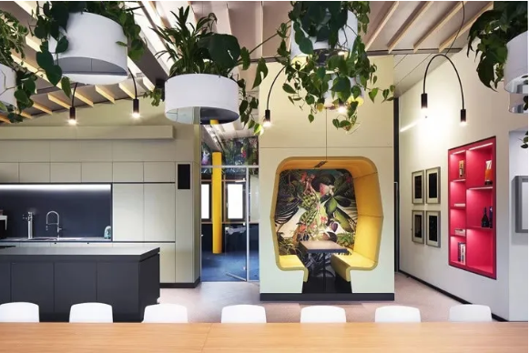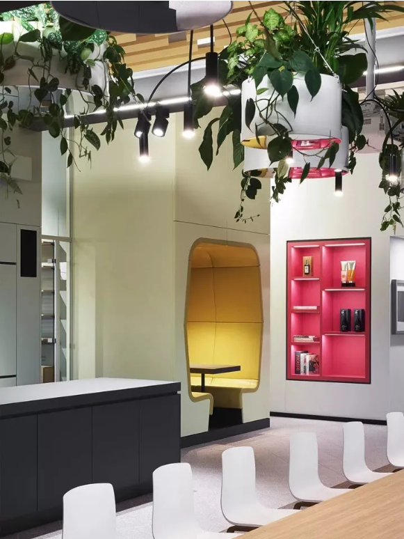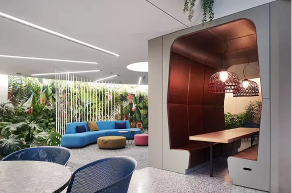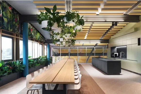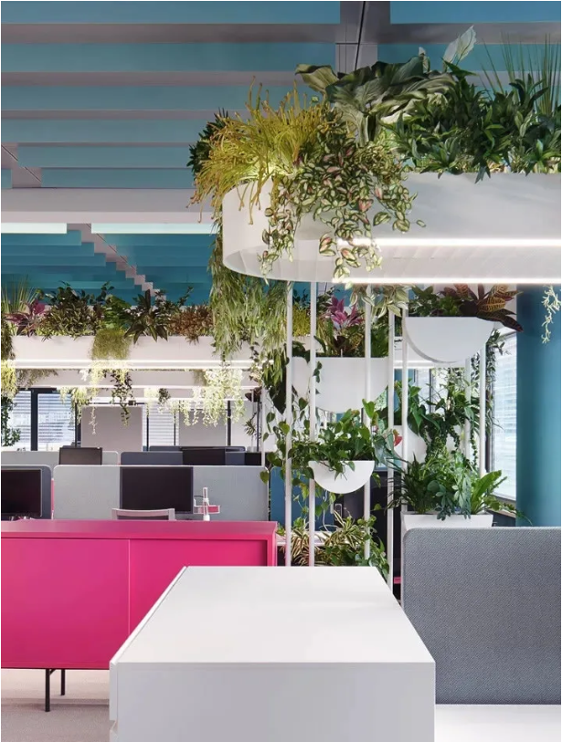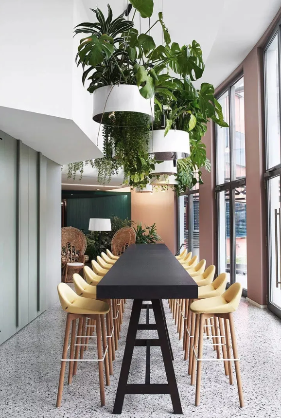 首先,設(shè)計團隊為這處工作場所增添了2100個超級盆栽植物。綠植能產(chǎn)生良好的情緒、降低精神壓力、促進(jìn)創(chuàng)新、提高績效。此外,綠植還能改善空氣質(zhì)量、營造健康環(huán)境,并起到降噪的作用。它們只需定期澆水就能保持茂盛狀態(tài),因此深得人心。室內(nèi)盆栽植物具有強大的正能量。自從加入了這些綠化,室內(nèi)濕度不僅從18%增加到44%,讓人們的體感非常舒適,連員工的病假都減少了一半!
