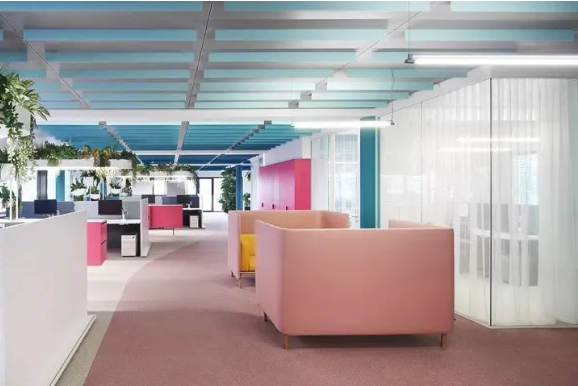 在這個項目中,一個令人著迷的挑戰(zhàn)是在不干擾現(xiàn)有結(jié)構(gòu)的情況下徹底改造建筑物。設(shè)計團隊通過改變天花景觀來塑造一個完全不同的場景氛圍。在原有天花板的下面增加彩色條板裝飾。漸變的彩色條板取代了原來的灰色金屬天花板,不僅創(chuàng)建了空間的進(jìn)深感、也讓身心感覺舒適。藍(lán)色,是一種讓人寧靜的色彩,同時能夠促進(jìn)創(chuàng)造力。藍(lán)色向白色的漸變,增添了空間的開放感和輕盈感。