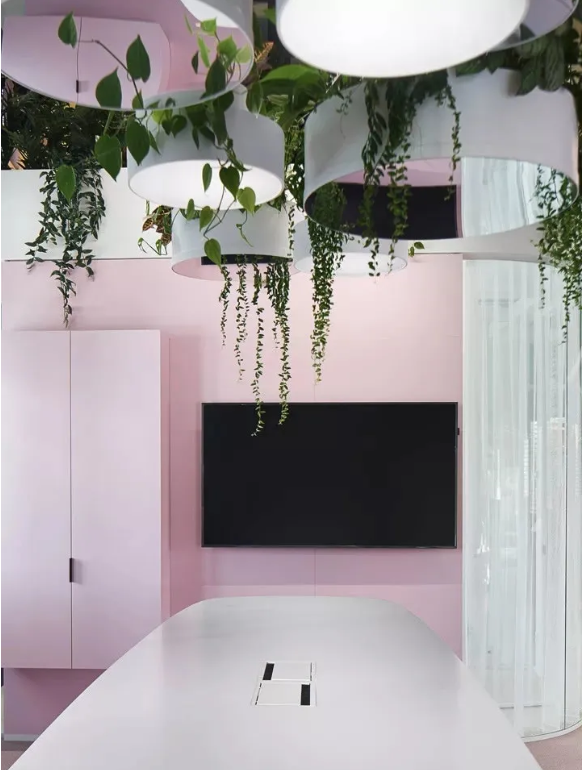 工作區(qū)采用中性色設(shè)計,利于專注工作。淡粉色的走道是真正的情緒助推器,它喚起了員工之間的情感共鳴。精心布置的水源和雅致的燈光設(shè)計有助于帶來更愉悅的心情。熱帶壁紙與柔軟的沙發(fā)和小圓桌塑造了一個熱情洋溢的活力氛圍。
