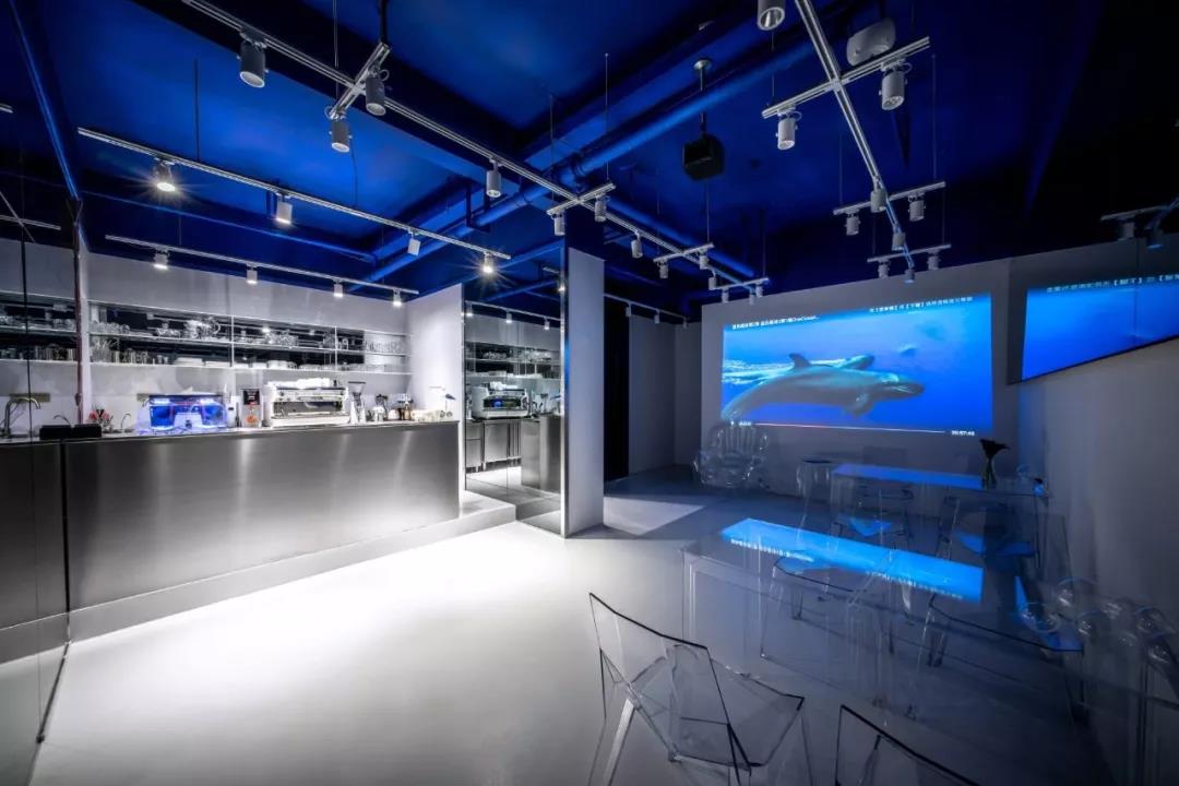 帶著這樣的邏輯,整個空間的設(shè)計就很明確了,拆除原有的吊頂,用涂料做成藍色的“天空”;下面的空間則使用帶有反射性/透明性的材料——鏡面、金屬、亞克力、塑料等,通過這種曖昧的委婉的,而非簡單粗暴的方式,讓深海的藍色充滿整個空間。