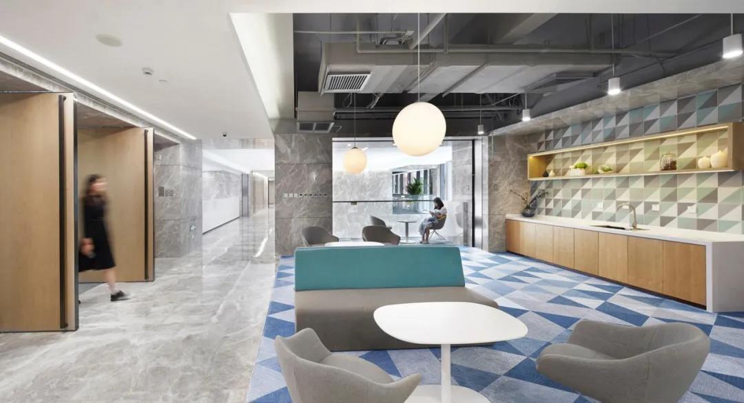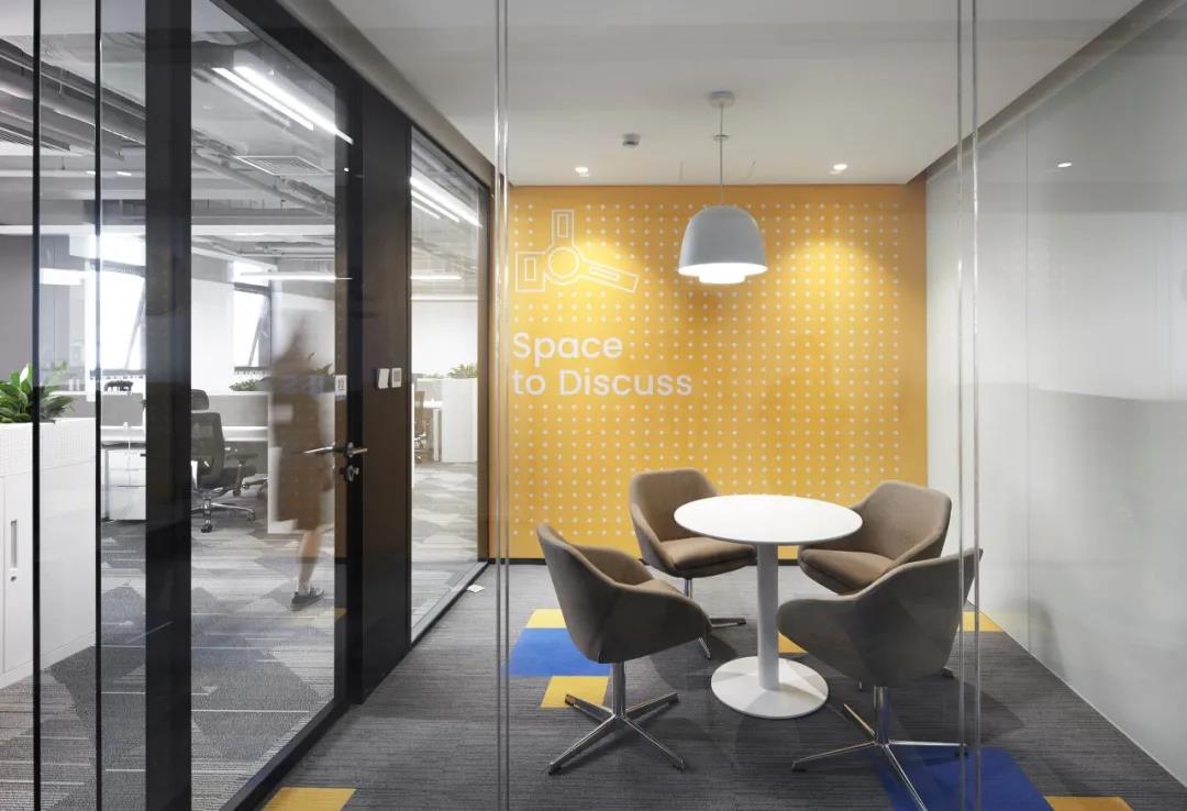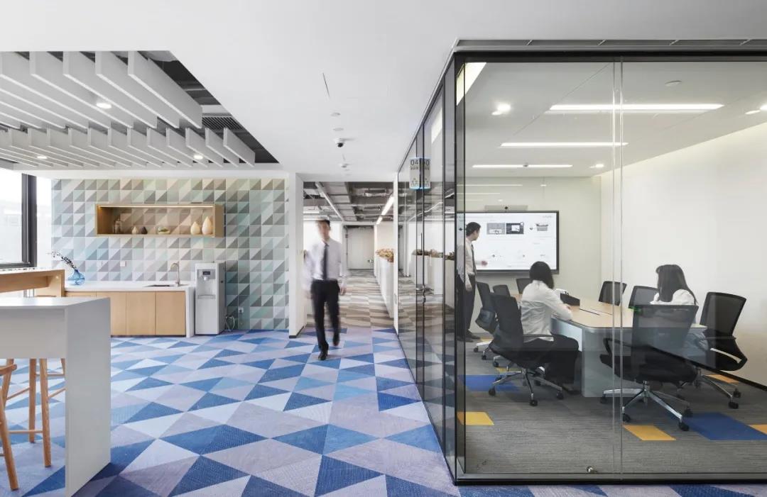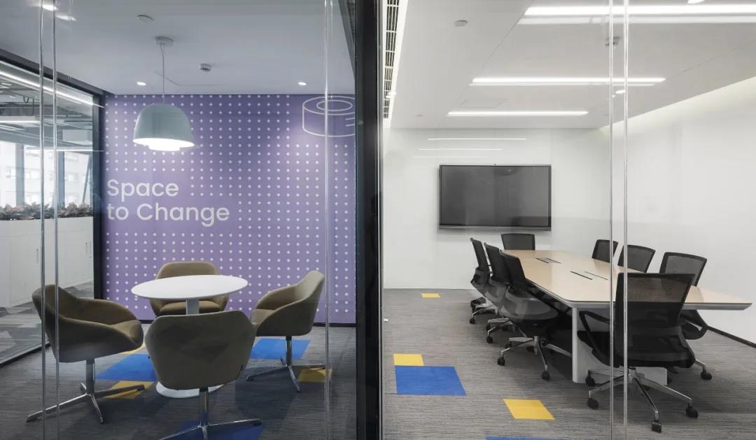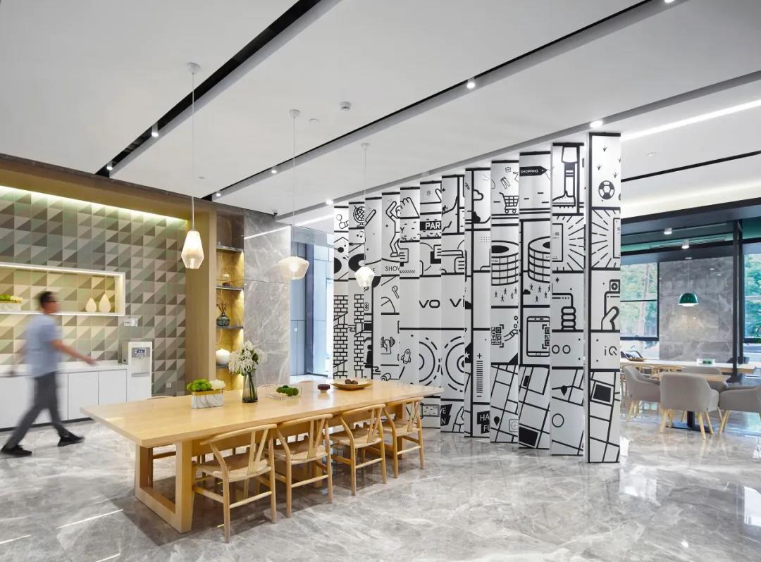采用低飽和度的幾何圖樣壁紙,將vivo工業(yè)園,東莞總部,重慶vivo的建筑外形提煉出元素與洽談室巧妙結(jié)合,增強vivo的空間專屬性和親切性。