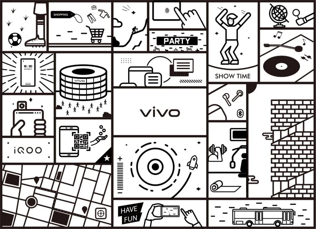 咖啡廳翻轉(zhuǎn)板設(shè)計的插畫,由vivo手機不同的使用場景組成,傳達(dá)品牌精神。