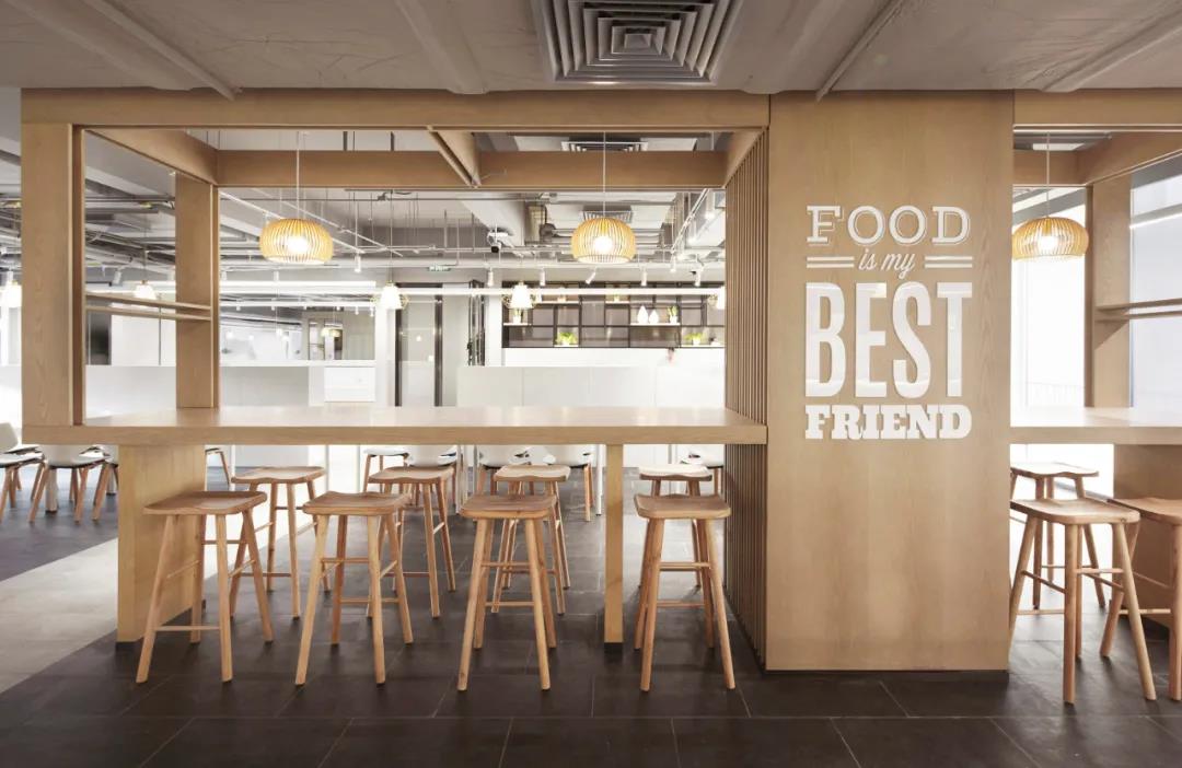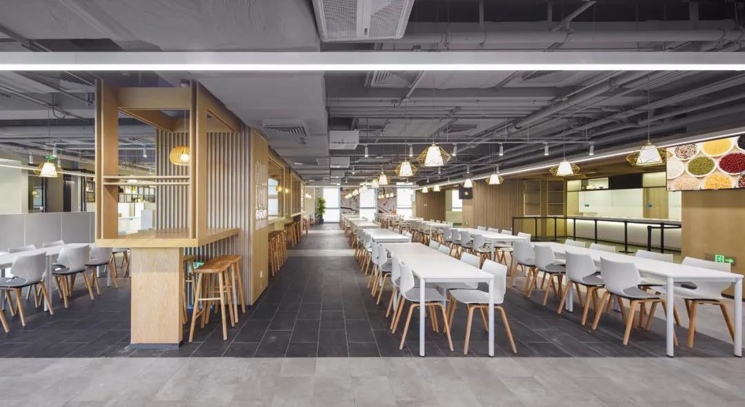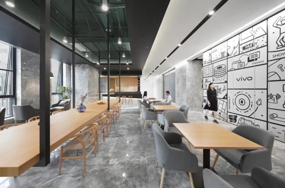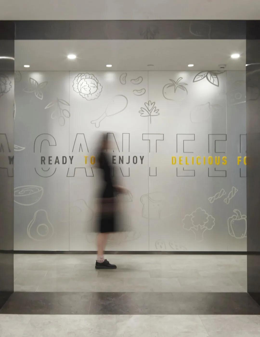 不同于其他辦公樓餐廳布置在地下層,vivo以三層作為生活服務(wù)區(qū),集中布局健身和餐廳,方便管理并對其他辦公層影響較少。餐廳入口使用磨砂鏡彩繪圖案,指示清晰,內(nèi)部通過地面鋪磚、桌椅組擺等方式設(shè)置出等候,取餐,就餐,收盤等交通動線,維護(hù)空間秩序,營造出輕松舒適整潔的就餐環(huán)境。