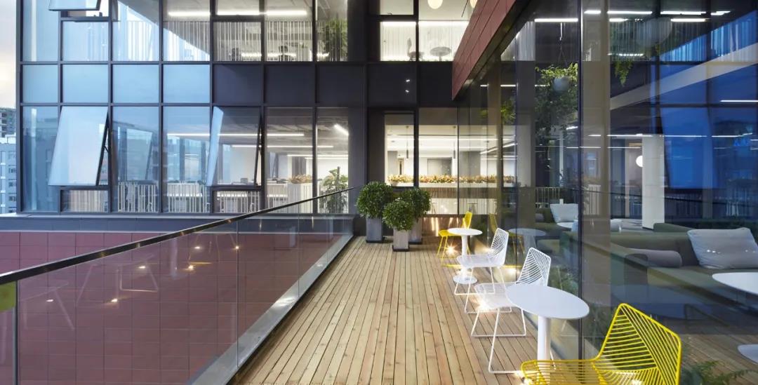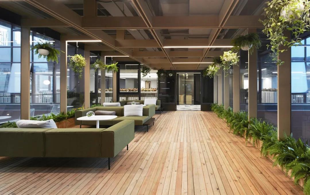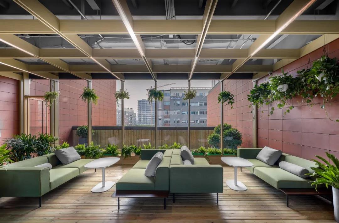 在建筑中段的4-6層,是一處半室外的連橋空間。通過結(jié)構(gòu)適度改造營建了三個疊落的空中花房,同時每個花房都配有戶外露臺作為空間延展。矩陣型木質(zhì)天花延伸到側(cè)墻并落地,地面鋪防腐木條,整個空間配備綠植,營造輕松、生態(tài)的戶內(nèi)外休憩空間,同時還可作為研討,舉辦小型活動的多功能空間使用。