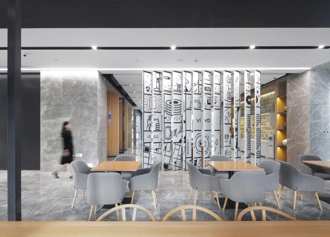 大堂作為整體的對外開放和形象展示空間,配備了咖啡,休閑茶水,展廳,洽談,會議等開放的功能性空間,配以圖像視覺傳達(dá)設(shè)計,軟植入vivo品牌精神。