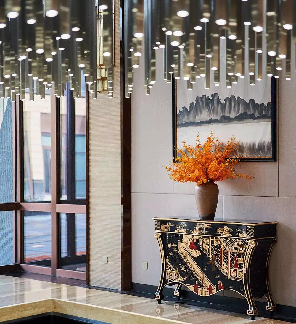 進入大堂中心,便被一個奪人眼目的裝置藝術(shù)吸引,數(shù)百根不銹鋼條垂吊而下,宛如瀑布“飛流直下三千尺,疑是銀河落九天”,成為整個空間的視覺焦點,啟動后,水珠從不銹鋼滴落到地景的水中,呈現(xiàn)出“大珠小珠落玉盤”的動感。