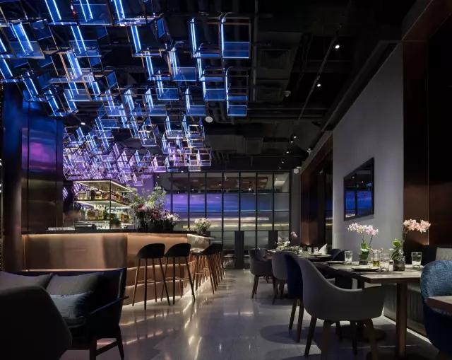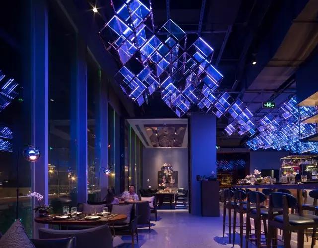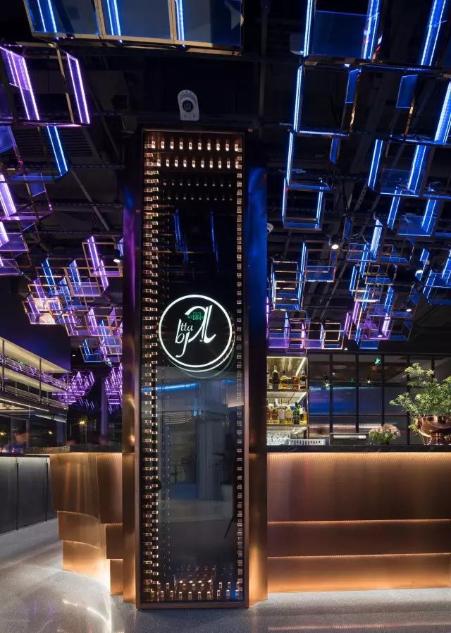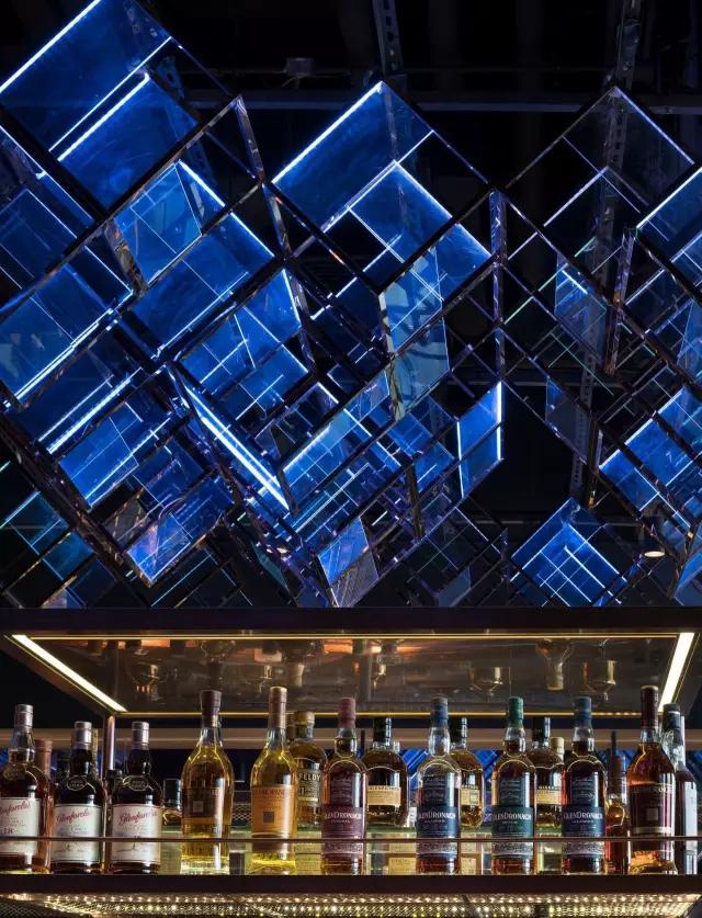 attabj意大利餐廳最美之處便是天頂上的藝術(shù)燈群,設(shè)計(jì)師通過(guò)抽象化、藝術(shù)化的手法,將這一感官體驗(yàn)濃縮為空間當(dāng)中的一組裝置,透明亞克力單元體如同酒杯內(nèi)的冰塊,而不斷變幻的LED燈光就像是色彩斑斕的酒體,兩者相互反應(yīng)形成夢(mèng)幻迷離的光影效果。